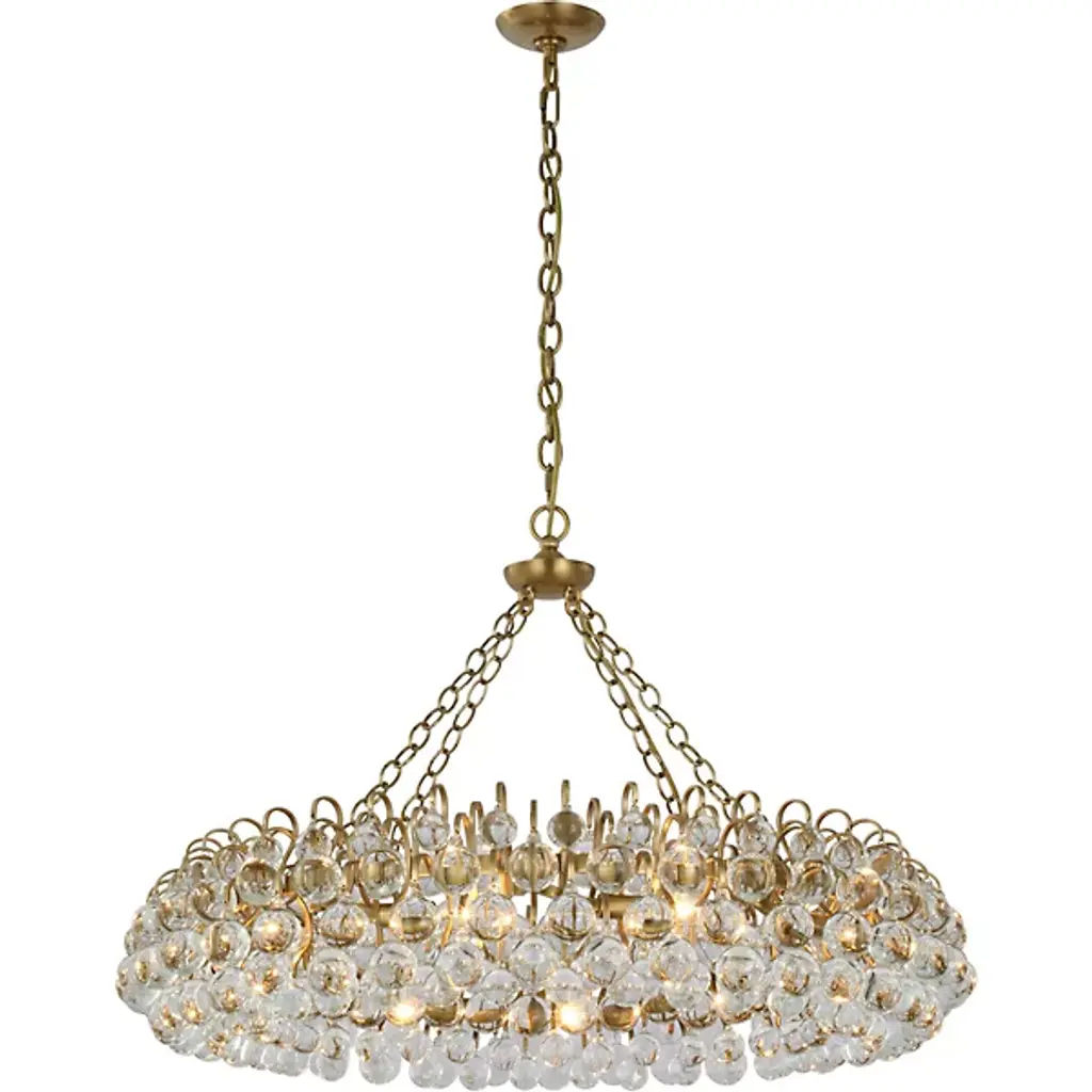 A bold display of vintage intricacy. The Bellvale Chandelier from Visual Comfort Signature, formerly known as Visual Comfort, starts simply, extending a short length of medium weight chain from a curving disc-shaped canopy to a small ring finial above a rounded, contoured hub. The lower hub anchors four lengths of finer chain that drop in opposing directions, sweeping down to secure a large, lower ring frame studded with small, strong lamping below. This frame supports dozens of slender metal goosenecks that arc out and down, suspending glass baubles around the larger ring structure to gentle glare from the damp-rated lamping while lending the piece a bold baroque presence.