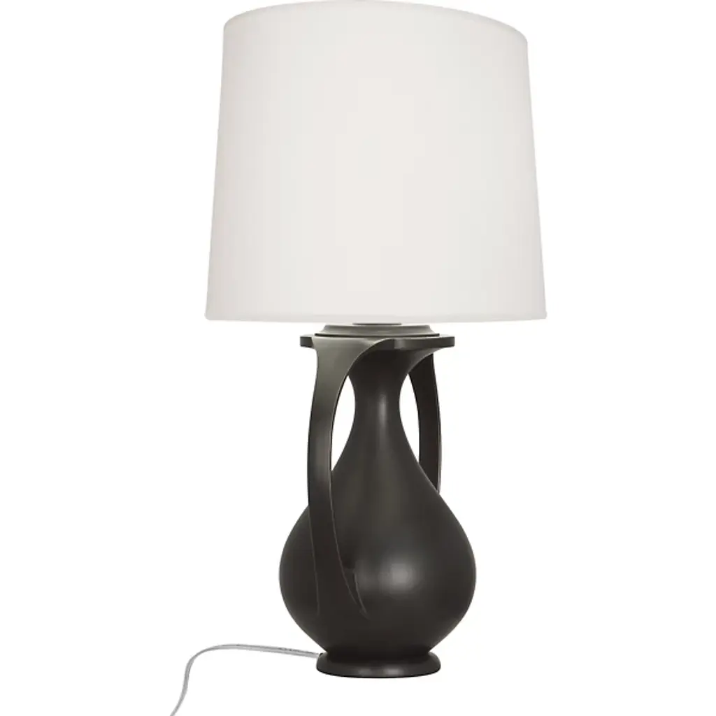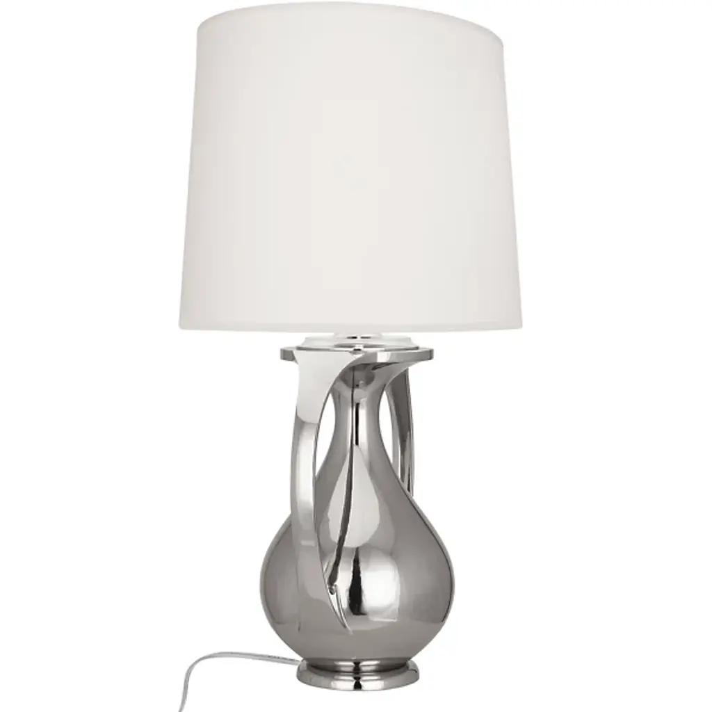 Bring a majestic quality to your home décor with the Belvedere Table Lamp from Robert Abbey. This piece makes a statement as an artful accent piece, whether on or off, with an elegant urn-shaped body accented by two rounded handles at either side. Its sleek metallic finish accentuates its gentle curves and reflects the warm light that emanates from behind a white silk shade above while a circular base elevates the piece from below.