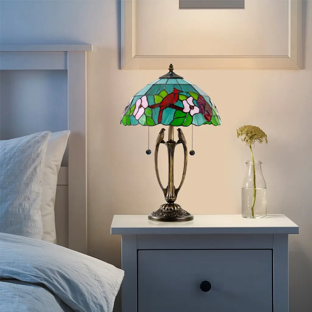 Pretty as a picture, our Benezia Birds Tiffany Table Lamp adds the ideal finishing touch to any décor in your home or office. The generously sized lamp features a large dome shade with a leafy green background that depicts a lush tree. A wide branch of pink, red and amber pansy blossoms, each dotted at its center with an art glass gem, runs around the circumference. Vibrant red cardinals with intricately detailed black filigree are perched at intervals that add to the realistic feel. The beautifully car base is finished in Antique Bronze and features a meticulously cast floral pedestal. Around the center column, a pair of beautifully cast birds with elongated tailfeathers create a split column effect. A perfect choice in a living room, den, bedroom or office, our Benezia Birds Tiffany Table Lamp also makes an ideal gift for an avian enthusiast or bird watcher.
