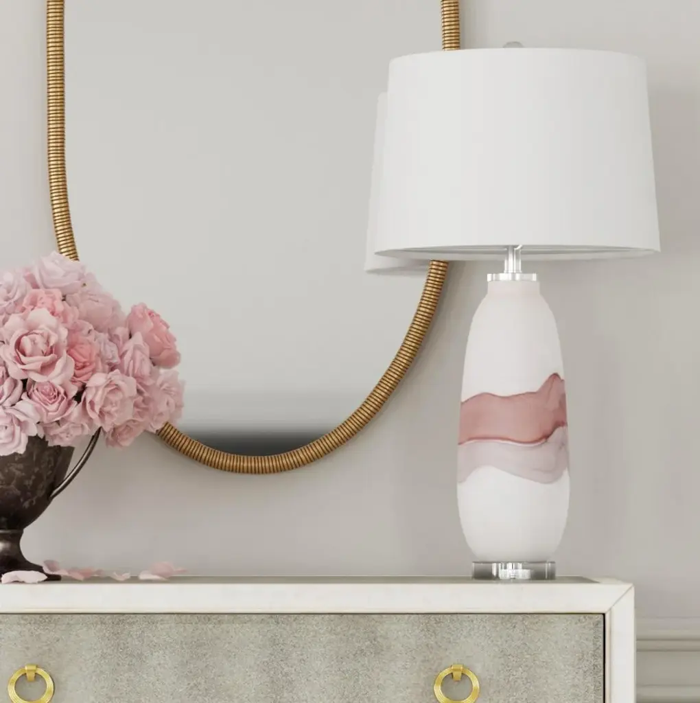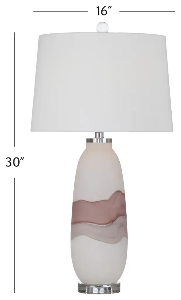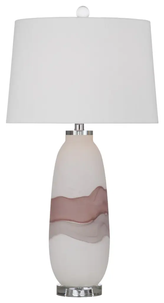 The Benin Table Lamp features an art glass body with a white linen tapered shade. Finished in matte white, mauve, and gray, this lamp harmonizes a palette of subtle and elegant tones. Meticulously crafted with attention to detail, the Benin Table Lamp stands as a refined addition to interior spaces, seamlessly blending enduring elements with a touch of contemporary sophistication. The matte white, mauve, and gray finishes complement the art glass body, creating a visually appealing contrast. With its stylish design and meticulous craftsmanship, the Benin Table Lamp not only adds a modern edge to any room but also provides a soft and inviting illumination, making it a versatile and impactful contribution to interior decor.Features:This beige colored table lamp features a modern style.The tapered drum shaped lamp shade is constructed with white linen.Features a 3 way switch.Lamp cord measures 6 inches, allowing for easy placement.Bulb type a required, not includedEasy assembly - just attach harp, finial and shadeFor over a century, Bassett Mirror has been synonymous with style and quality, transforming homes with its sophisticated and timeless designs. With a wide-ranging collection of furniture, lighting, mirrors, and art, Bassett Mirror seamlessly blends modern style with classic appeal. From rustic modern to luxe glam, each piece is thoughtfully crafted to inspire and elevate any space. Committed to exceptional value and customer care, Bassett Mirror makes it easy for homeowners to create beautiful, personalized interiors with confidence.