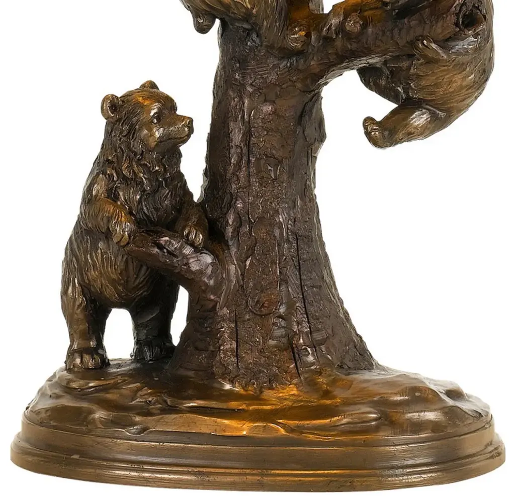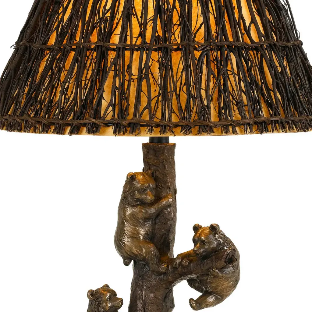 Improve the aesthetics of your living space by the inclusion of this sophisticated table lamp. Crafted from resin in a black finish, it features 3 bears playing and climbing up a tree and showcases stylish carved details. It features a shade with real twigs, woven together to keep them in place.