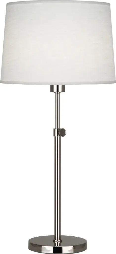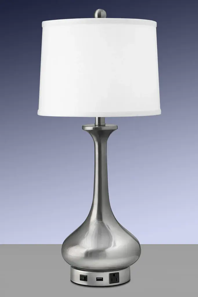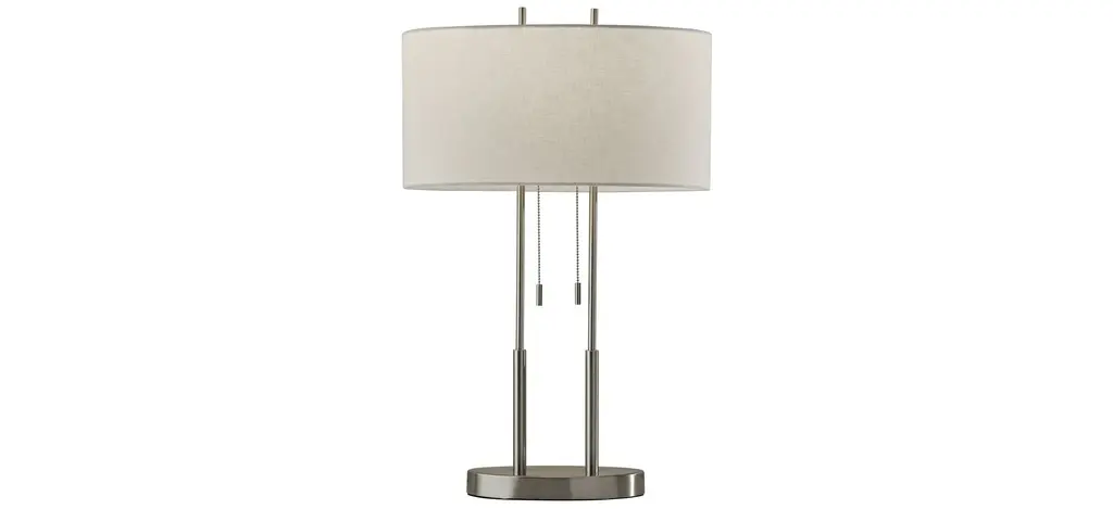 Grant an industrial touch to your living space with the inclusion on this amazing table lamp. It features a tubular metal body with a fabric drum shade and incorporates on off rocker switch for seamless control. It is supported by a circular base, provided with a power outlet.