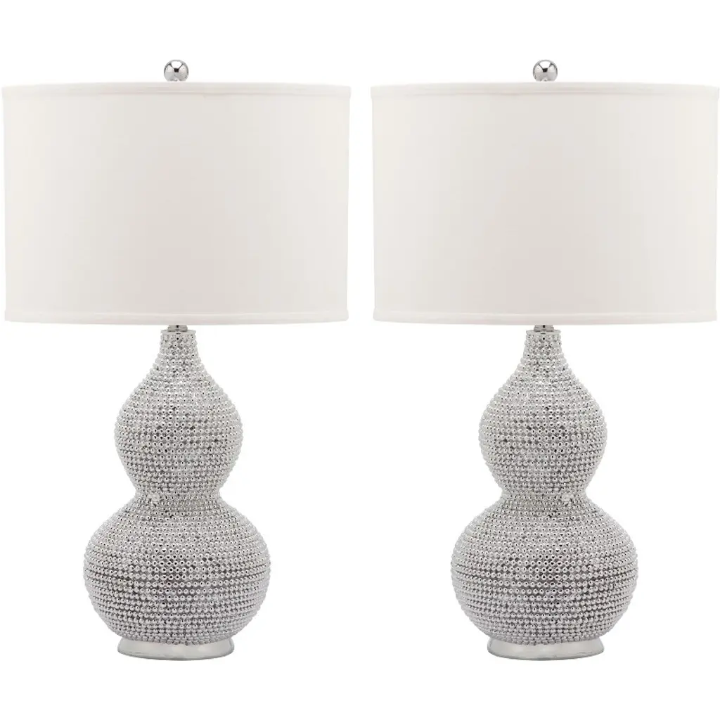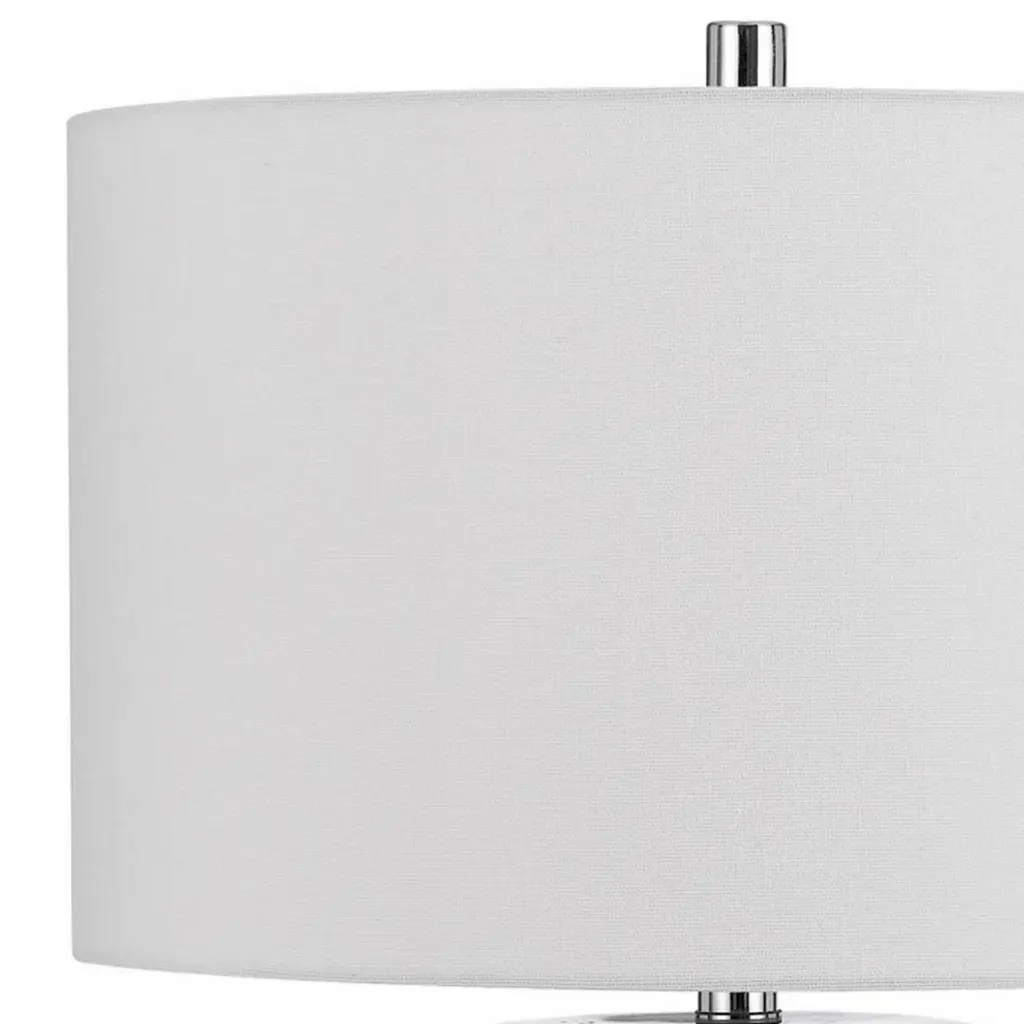 Striking, attractive, and uniquely crafted, this accent table lamp, available in a set of two, brings charm to any interior space of your home. Featuring a studded pattern ceramic base, the piece has a three way dimmer switch and a white hardback fabric drum shaped shade to filter light for a versatile application in both relaxing and work intensive times alike