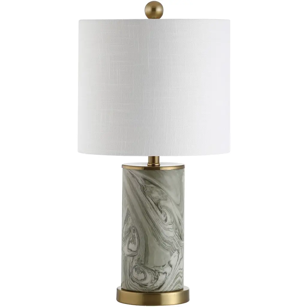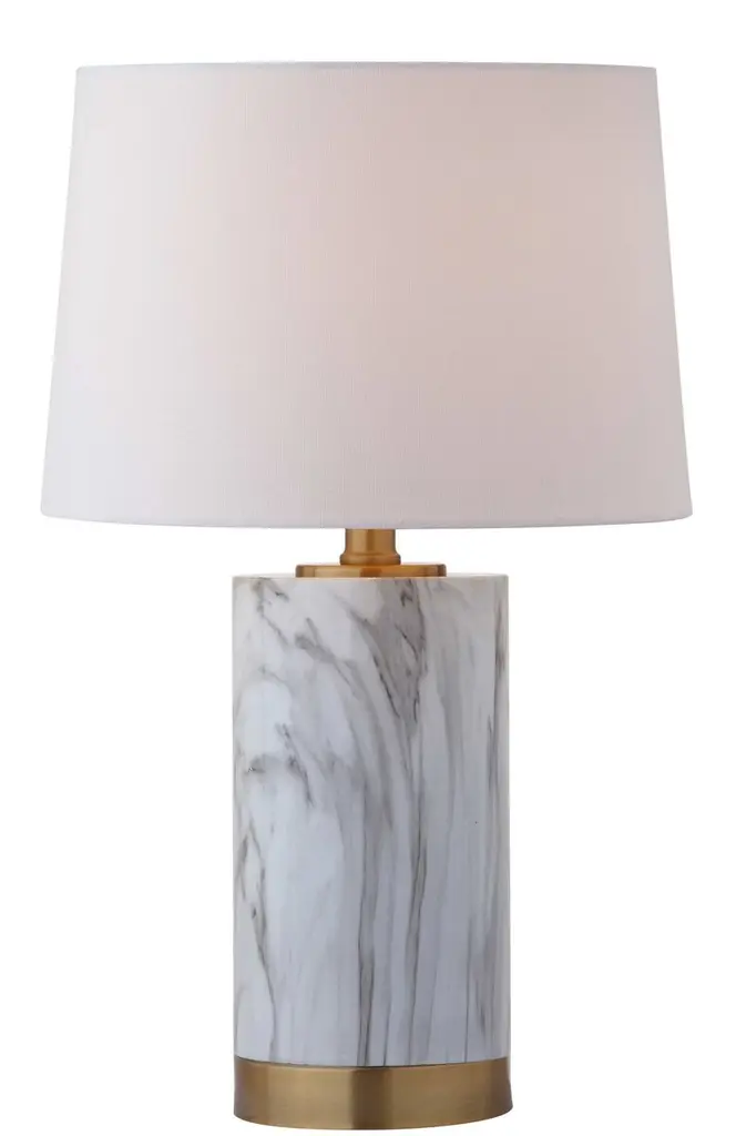 Citing its inspiration from the luxury furnishings of a Mykonos resort, this table lamp pairs a cylindrical white and black marble patterned base with brass-finished accents and a crisp cotton shade.