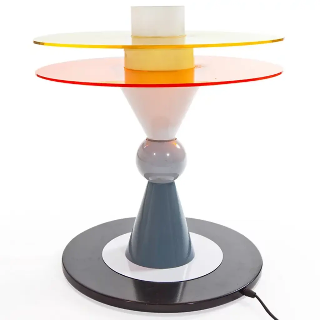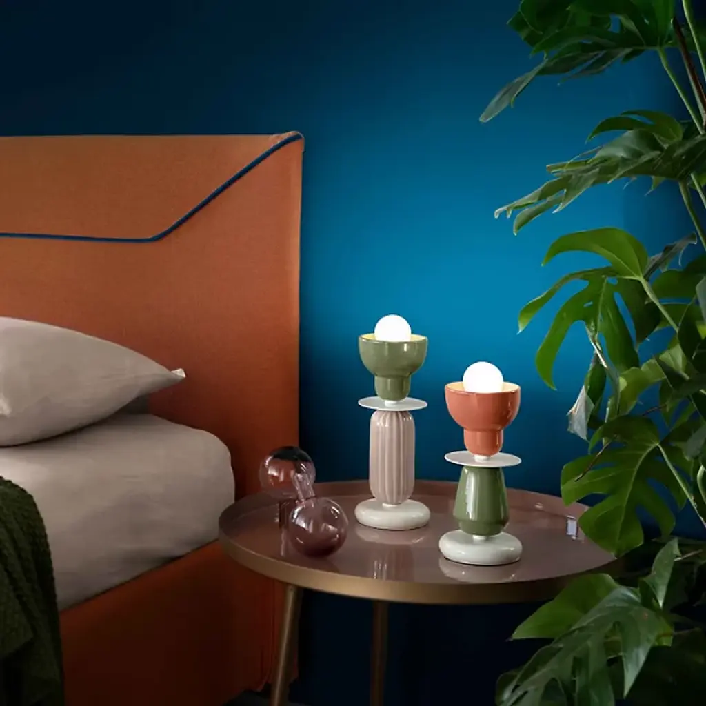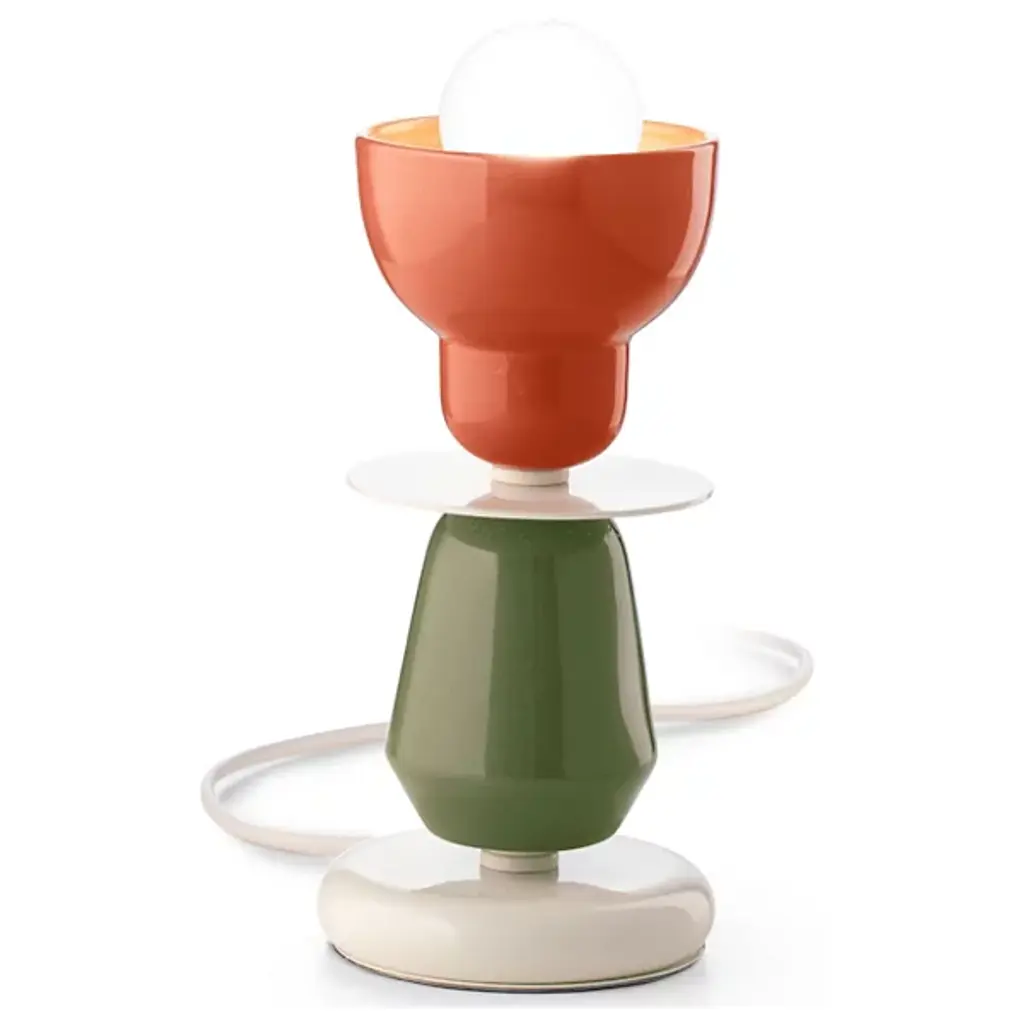 The Berimbau Table Lamp from Ferroluce gets the eyes flowing up and down with a grouping of colorful shapes glazed in cozy light. This metal and ceramic luminaire underscores Ferroluce’s focus on harmonious shapes and antique craftsmanship. The table lamp takes up minimal space with a compact base. Its tapered body and rounded shade contrast against each other with vibrant natural tones. A disc accent between them accentuates their silhouettes. The lamping peeks out the top. It turns on to deliver an upward streaming ambient light.