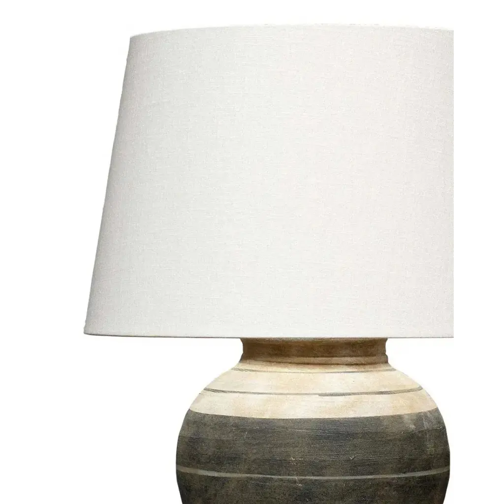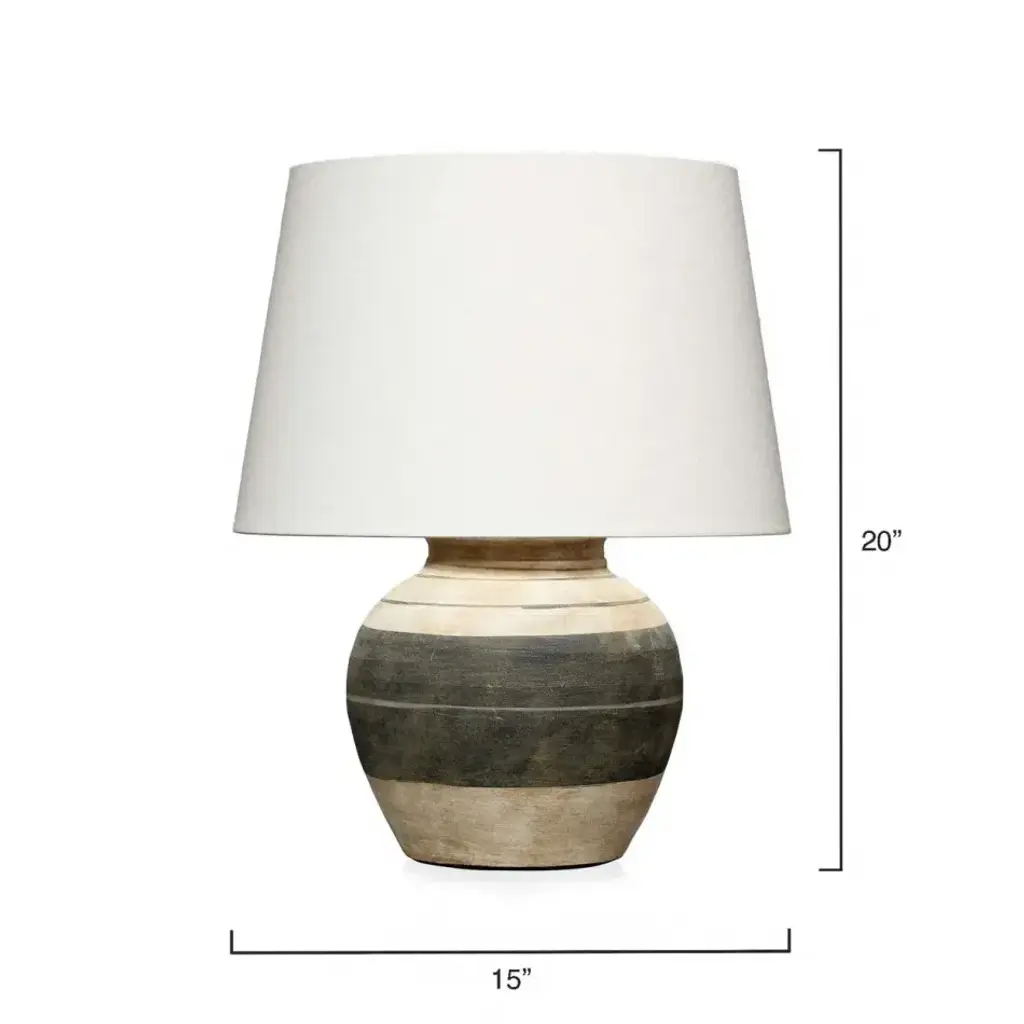 This ceramic table lamp may be small in stature, but its alternating stripes add a bold touch to the body's antique pot shape. Hand-crafted by skilled artisans, the natural variations in tone and subtle markings evoke a natural feeling of warmth with a modern touch. The petite size of this table lamp is perfect for an entry console or bedside table.