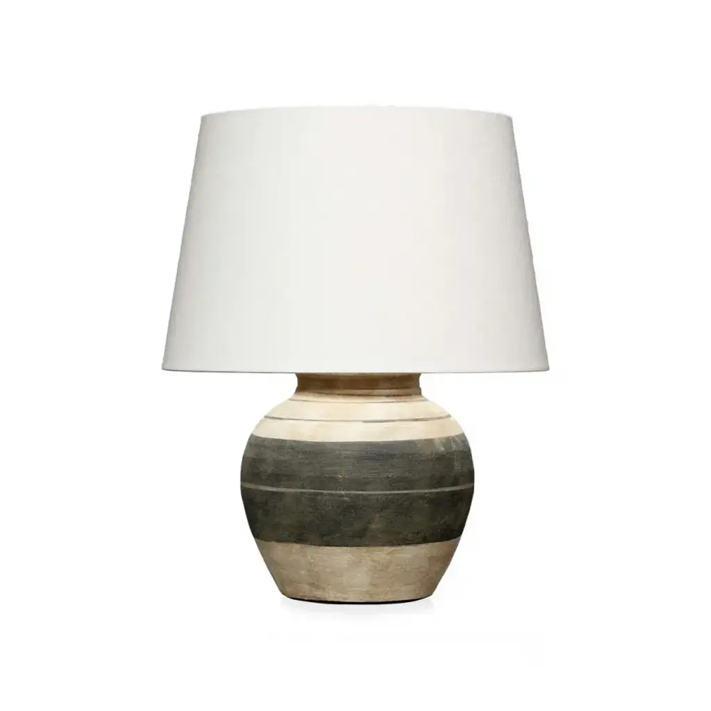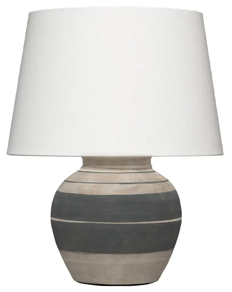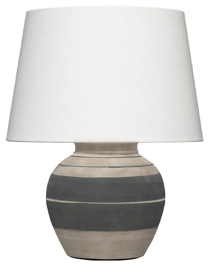 The Bernard Table Lamp from Jamie Young Co. may be compact, but its graphic pattern delivers a bold punch for the eyes to see. The table lamp's body recalls the antique pot shape with its generous curves. Made from ceramic, the body gives off a rich artisanal quality. A neutral earthy color palette creates a warm feeling on the graphic stripes covering the body. The fabric shade keeps it classic as a tapered drum, diffusing light with a cozy feeling.