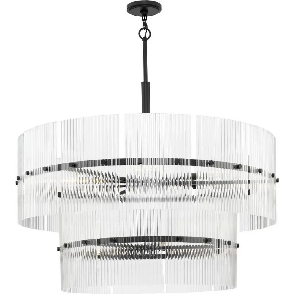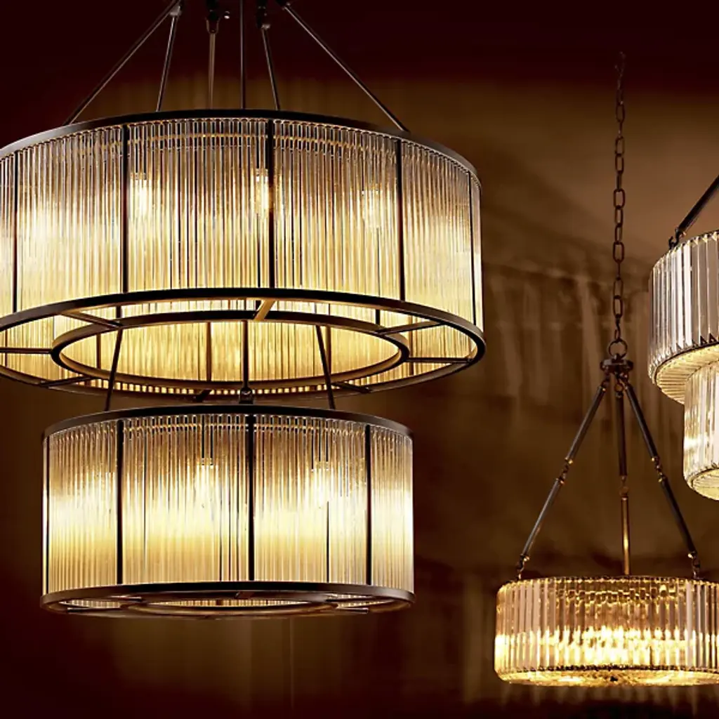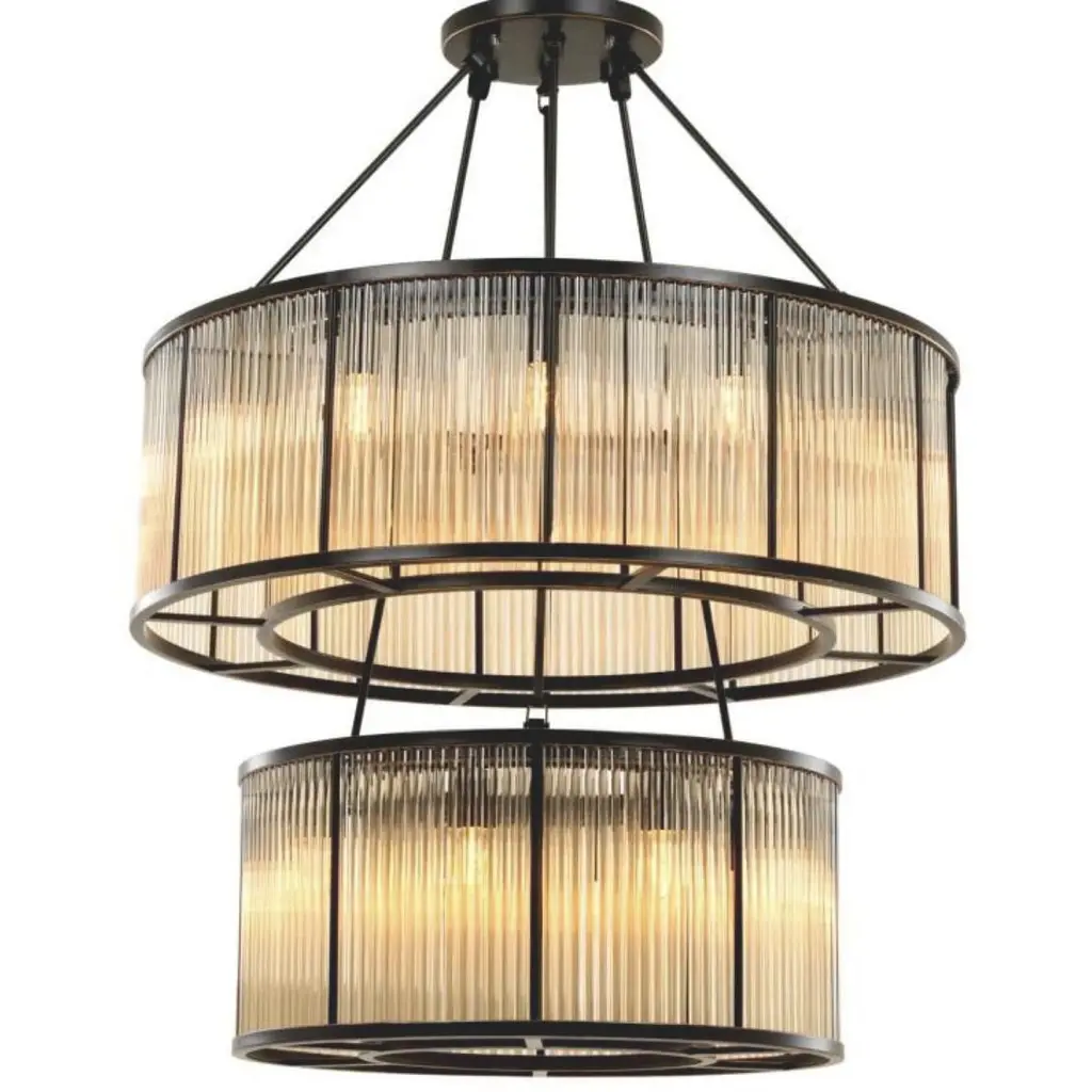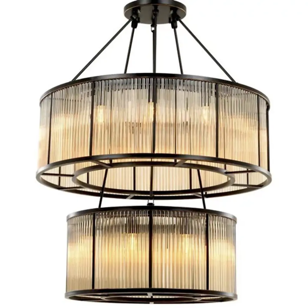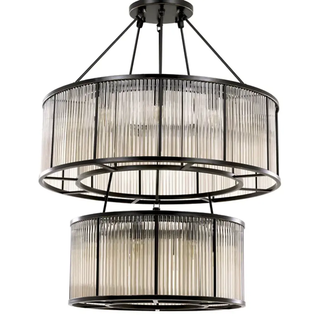 An inspired assembly of Art Deco elegance. The Bernardi Chandelier from Eichholtz descends from a smooth disc canopy, using slender rods to suspend two tiers of metal drum structures, a larger one atop a smaller one, around downward-oriented lamping. A set of clear glass rods acts as a translucent barrier on the outer edge of each drum, reducing direct glare to the sides and transforming it into a pleasing warmth that accompanies direct downlight.