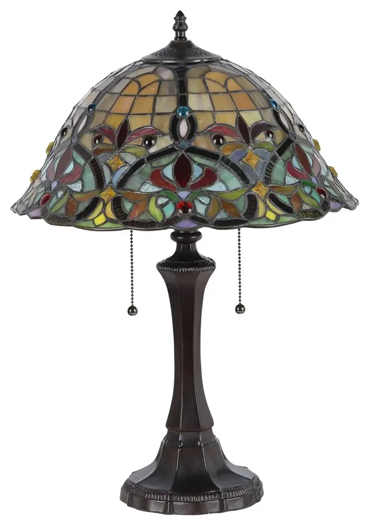 BERTRAM, a Victorian table lamp, has the style and colors to enhance any decor. Expertly handcrafted with top quality materials, including real stained glass, gem-like cabochons and sparkling crystals. The resin base is finished in an antique bronze patina.(2) 100 Watt max E26 Type A Bulb (not included)Pull chain switch522 pcs glass cut, 24 cabochons, 12 CrystalsDownlightIndoor SettingHarmonized code: 940520Since these are hand crafted products, the exact color of glass pieces may vary. Colors of the glass will appear darker and less vibrant when not illuminated. Handmade glass will vary from one piece to the other; glass made at different times will also vary. Light bulbs used in lamps or ambient lighting may affect the appearance of the products. Stained glass product has been protected with mineral oil as part of the finishing process. Please use a soft dry cloth to remove any excess oil.