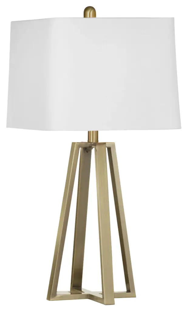 The Beryll Table Lamp is a harmonious blend of modern and traditional design elements. Its metal geometric brass base offers a sleek and contemporary look, while the square white shade adds a touch of classic elegance. This lamp is versatile enough to fit into various decor styles, bringing warmth and sophistication to any room. The 3-way switch allows for adjustable lighting, making it both a functional and stylish addition to your space.Features:Metal geometric brass baseSquare white shade3-Way switch for adjustable lightingBlends modern and traditional design elementsBulb type a required, but not includedEasy assembly - just attach harp, finial and shadeFor over a century, Bassett Mirror has been synonymous with style and quality, transforming homes with its sophisticated and timeless designs. With a wide-ranging collection of furniture, lighting, mirrors, and art, Bassett Mirror seamlessly blends modern style with classic appeal. From rustic modern to luxe glam, each piece is thoughtfully crafted to inspire and elevate any space. Committed to exceptional value and customer care, Bassett Mirror makes it easy for homeowners to create beautiful, personalized interiors with confidence.