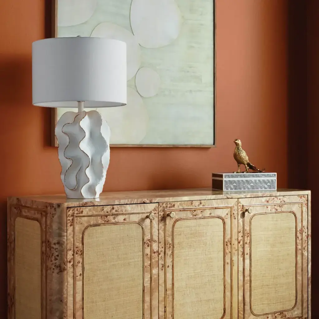 Undulating curves of mold-cast textured white resin soften the shape of a traditional urn lamp base topped with a linen shade. Now available in Navy!