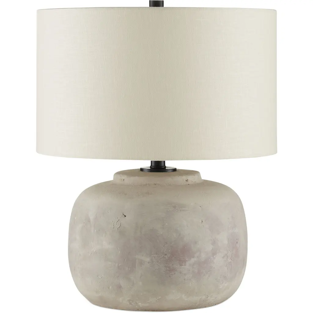 Patina is the name of the game with our Beton Table Lamp, the antiqued finish on the concrete lamp aptly named antique earth. This is one of our products that illustrates the talented finish artisans who so smoothly create the rough detailing that makes our new products look beautifully aged. We’ve topped this buxom piece with a light beige linen shade.