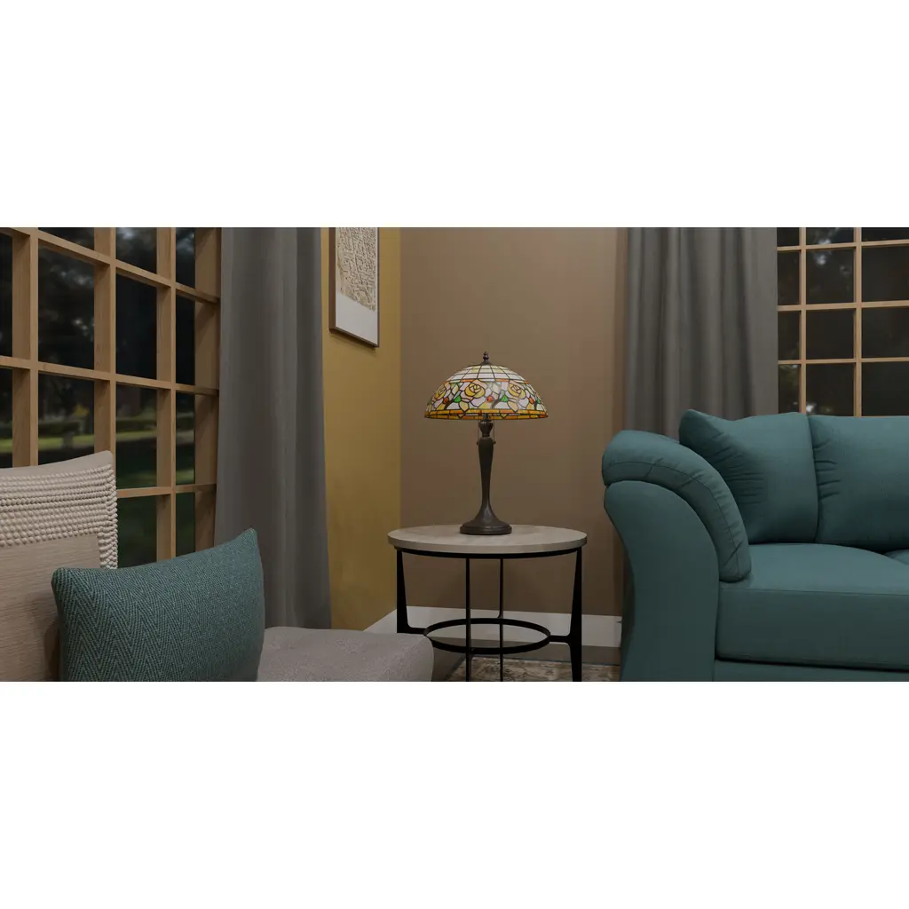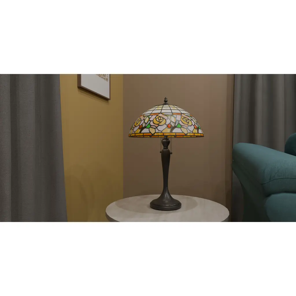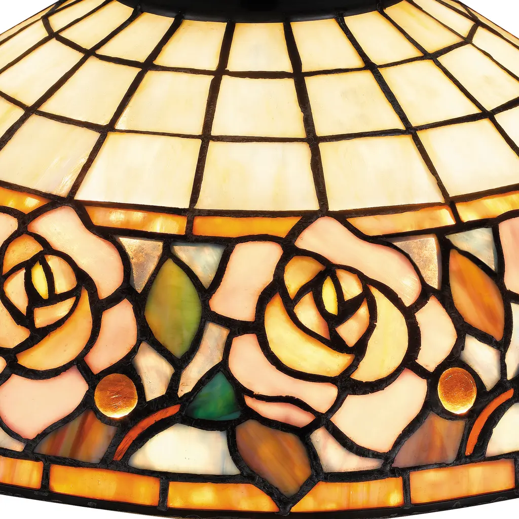 Betty's delicate, rose motif makes a pretty statement with multicolor art glass. The table lamp includes two pull chains and a classic, simple base finished in matte black. The Tiffany glass shade is hand crafted and hand assembled, creating a one-of-a-kind piece that is perfect for a bedroom, kitchen, or home office.