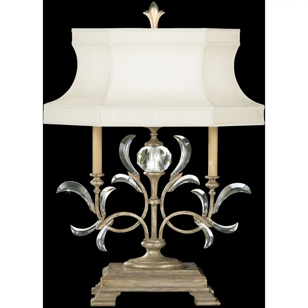 Table lamp in a gold leaf finish with matching candlesticks, featuring beveled crystals with laminated shade.