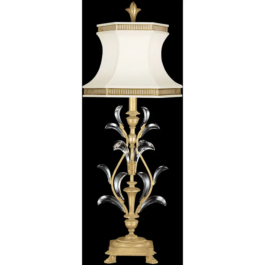 Table lamp of iron in a warm muted silver leaf finish featuring beveled crystal accents.