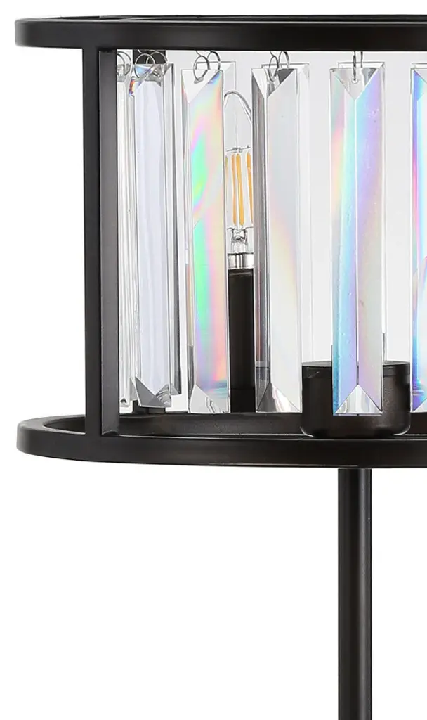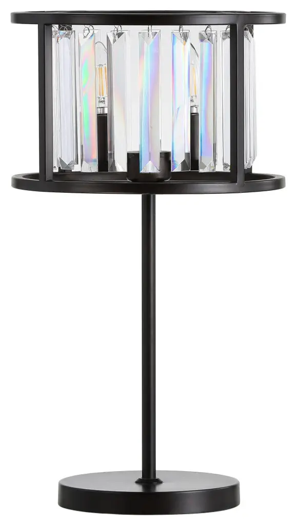 Thin linear crystals stand in for the glass cylinder shade of a hanging lantern in this sparkling, oil rubbed bronze table lamp. A fresh twist on a classic table lamp, two lights glow from the center, casting a beautiful refracted glow through the surrounding crystals. The overall silhouette is geometric and elegantly simple, but the sparkling details are distinctive and unlike anything else you''re bound to discover.Features:• This table lamp''s bronze hardware shines when combined with linear crystals• On-off in-line switch• Eco-friendly 4W LED bulb included• Takes two bulbs and compatible with any 9W LED or 40W TYPE "B" or 13W CFL• UL Listed • 0• Color: Oil Rubbed Bronze/Clear• Body Material: Metal / Crystal• Base Material: Metal• Includes: One (1) lamp(s)• Minor Assembly RequiredDimensions:• Lamp: 21.5 inches high x 11.75 inches wide x 11.75 inches deep• Shade: 7.75 inches high x 11.75 inches wide x 11.75 inches deepAbout us:You see a lamp.We see a decorative work of art.A perfectly curved shade casts a dramatic shadow on a floor. A silk cord you never want to hide. LED lightbulbs: as easy on the environment as they are on the eyes. The JONATHAN Y Lighting collection considers every detail from impeccably sourced materials to designer styling. And our prices are so attractive, we''ve transformed a functional necessity into a fashion accessory.JONATHAN Y Lighting - a fashion revolution in home decor.