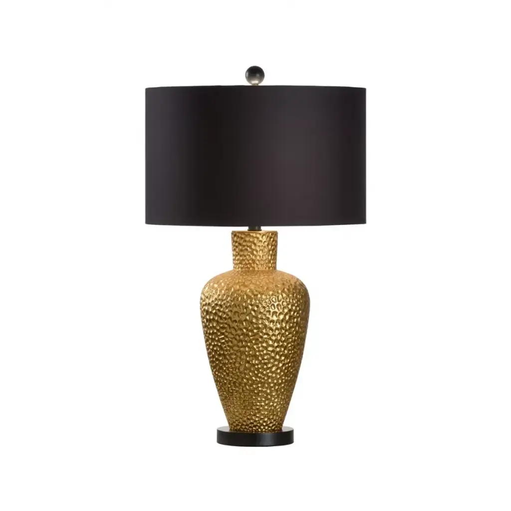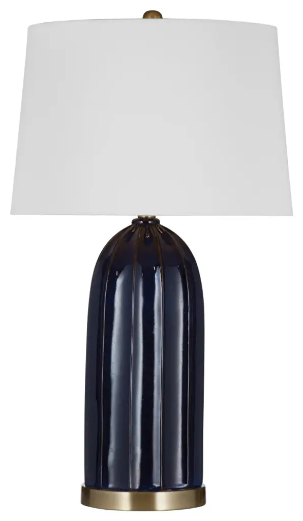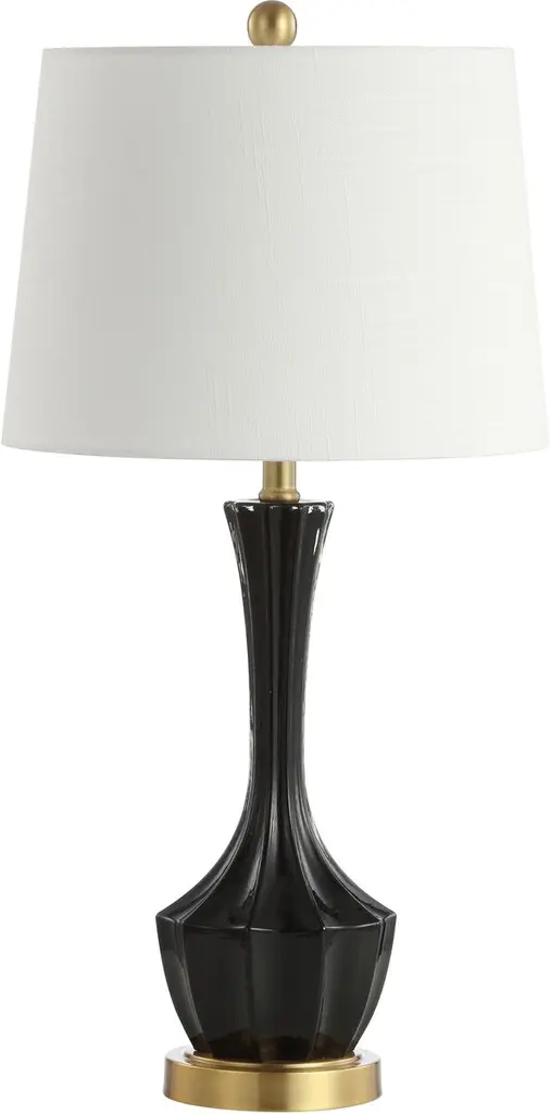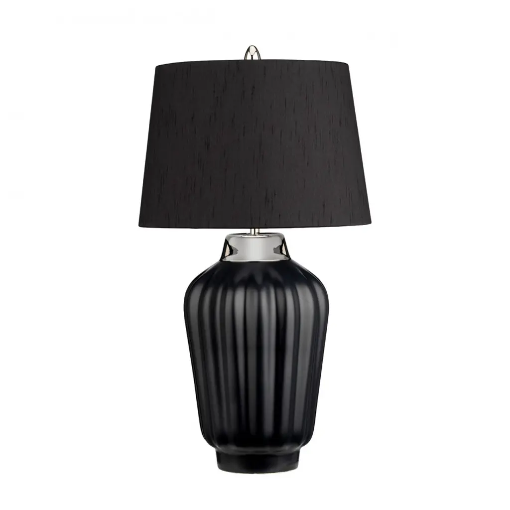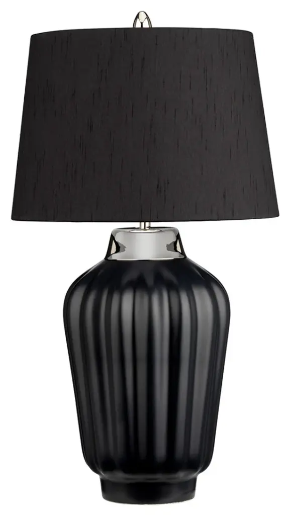 Bexley 1 Light Table Lamp in Black and Brushed Brass. Compact and simple design with metal cap and delicate ribbed detail. Topped with a black shade with gold lining