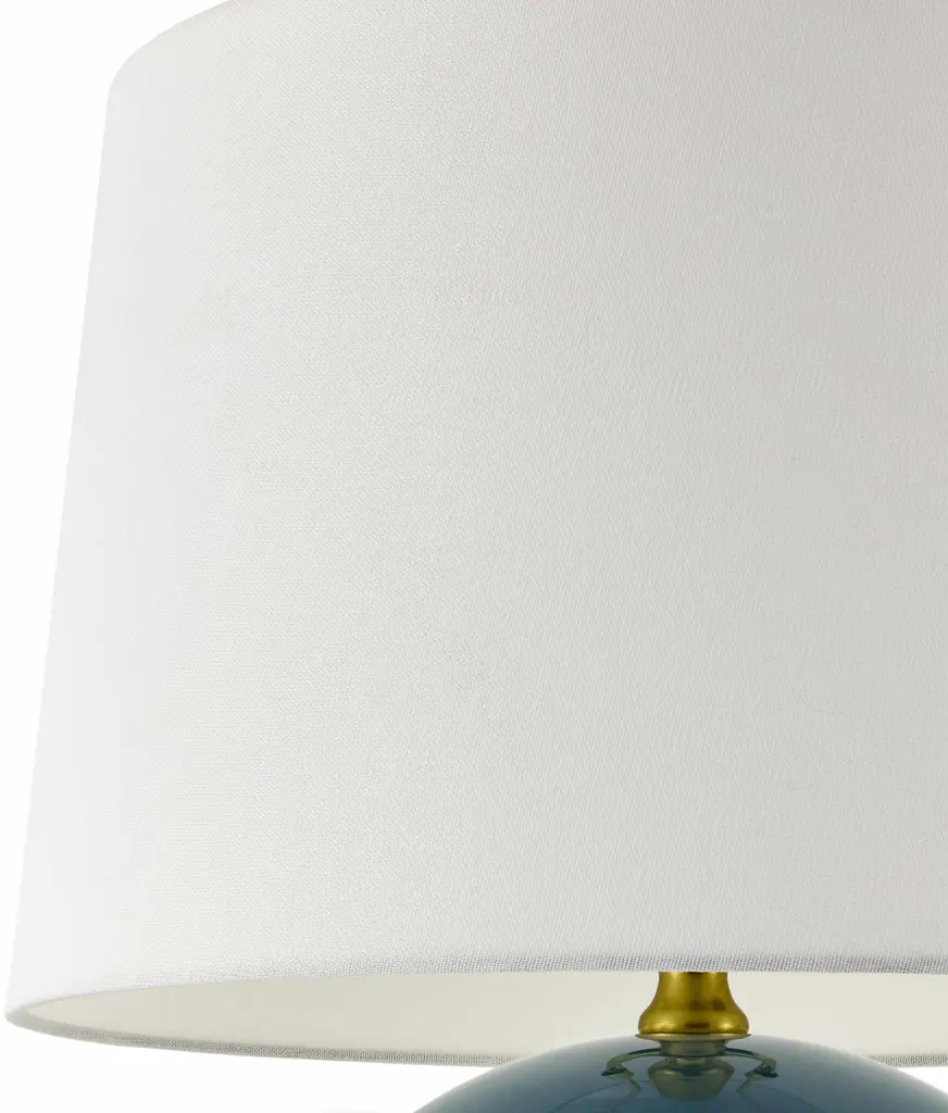 Collection: Bhadravati Colors: Blue, White, Metallic - Brass, Translucent Material: Body: Ceramic / Shade (Outside): Polyester / Finial: Iron Styles: Traditional Made In: China Lighting Type: Accent Table Lighting Shade Material: Polyester Shade Color: White Cord Length: 6' Switch Type: On/Off Number of Bulbs: 1 Socket Type: E-26 Bulb Wattage: 100W