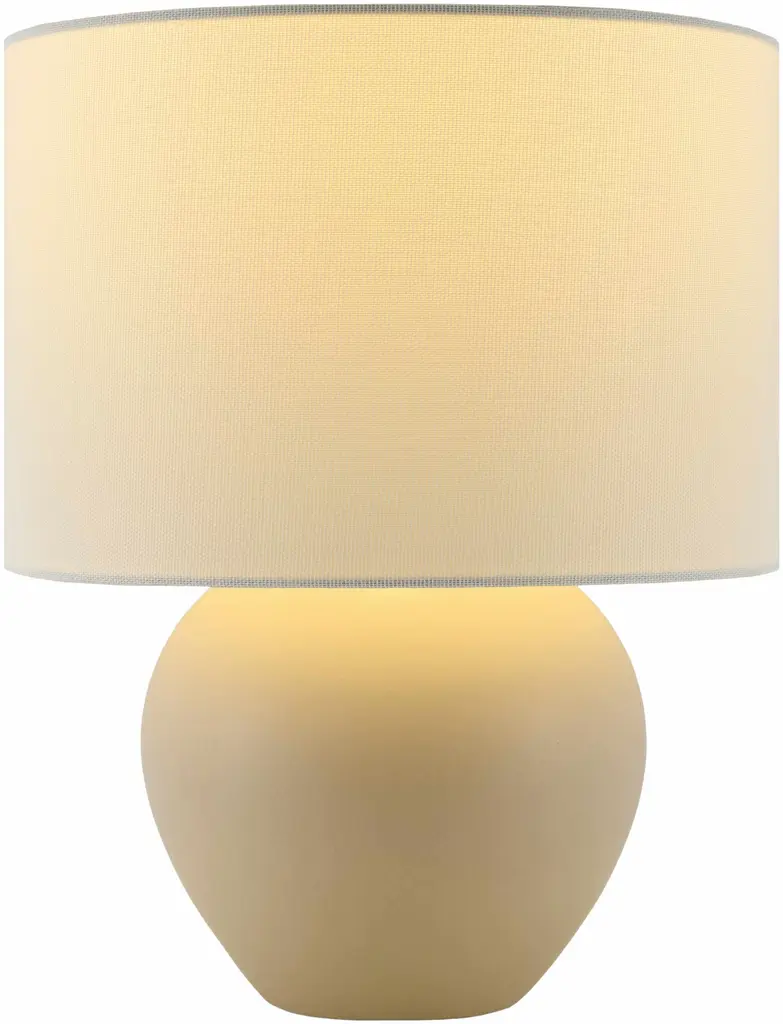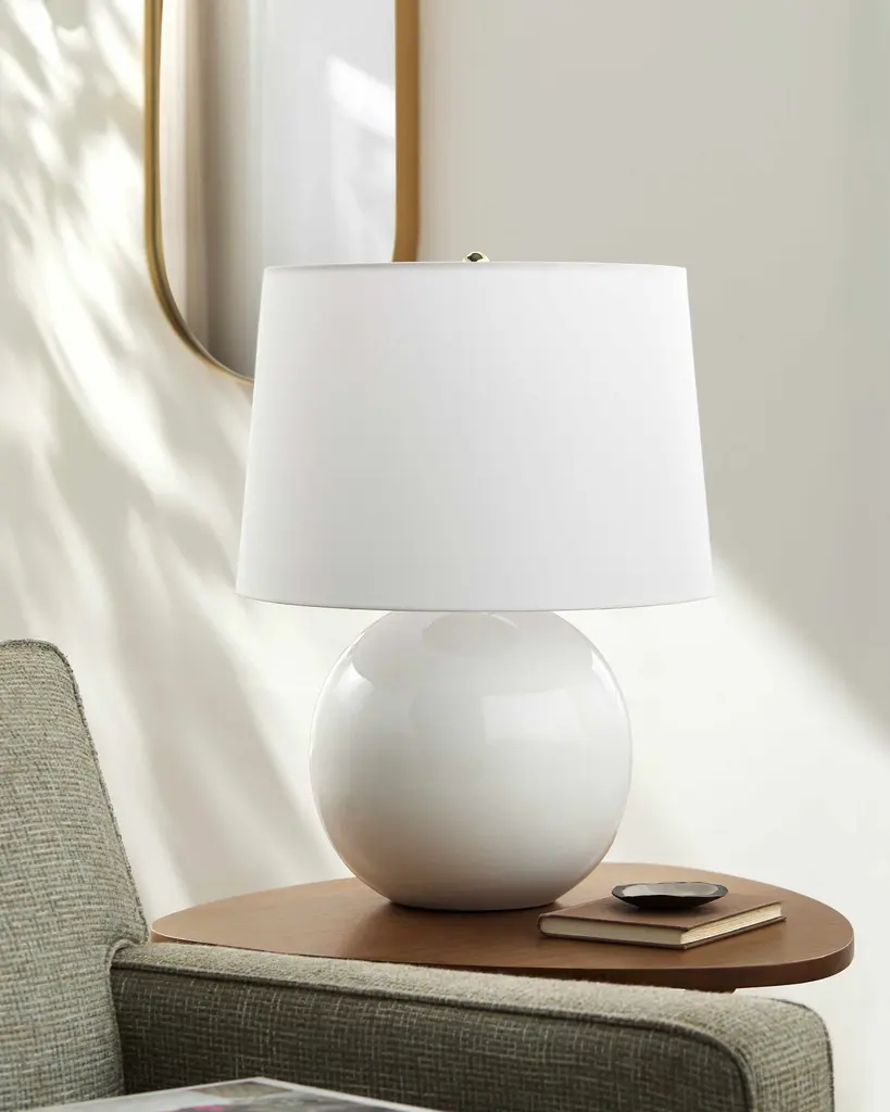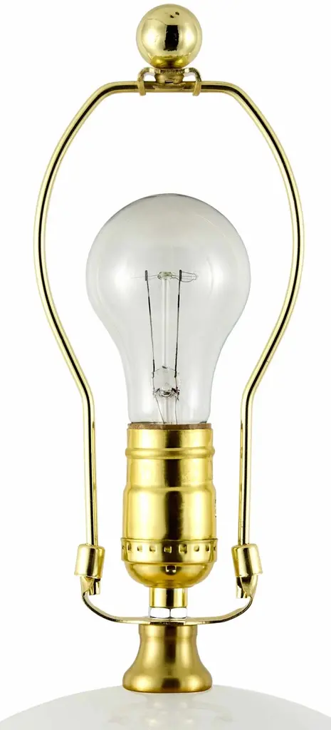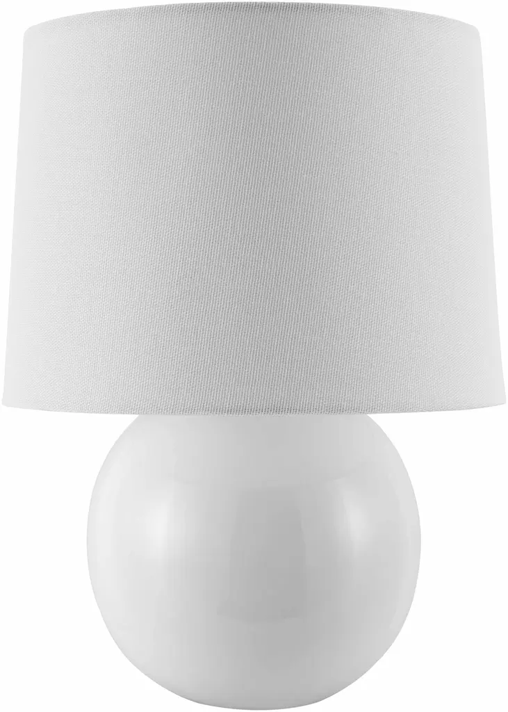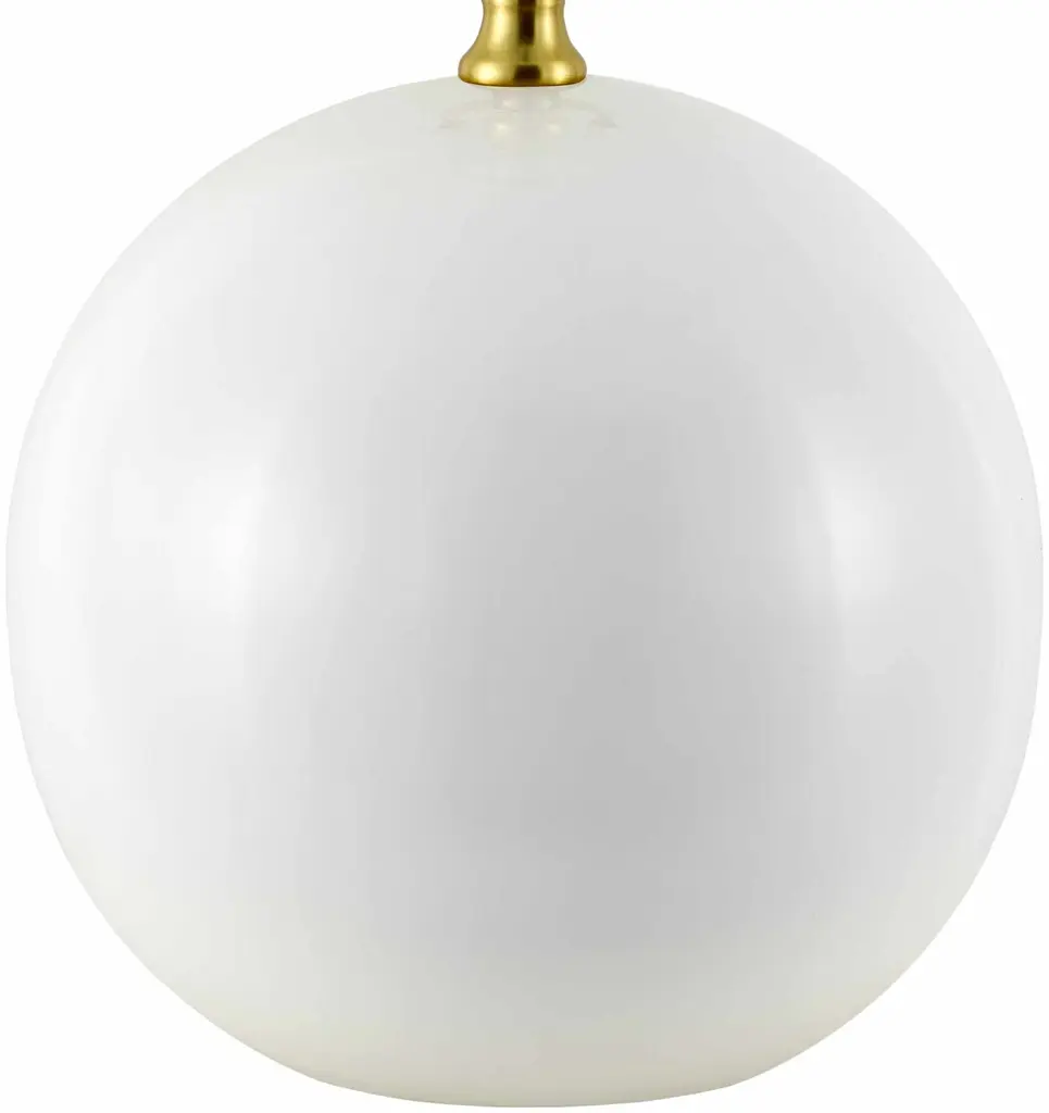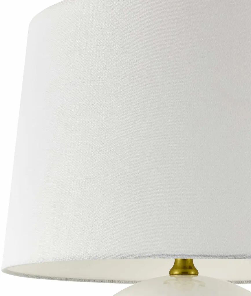 Collection: Bhadravati Colors: White, Metallic - Brass, Translucent Material: Body: Ceramic / Shade (Outside): Polyester / Finial: Iron Styles: Traditional Made In: China Lighting Type: Accent Table Lighting Shade Material: Polyester Shade Color: White Cord Length: 6' Switch Type: On/Off Number of Bulbs: 1 Socket Type: E-26 Bulb Wattage: 100W