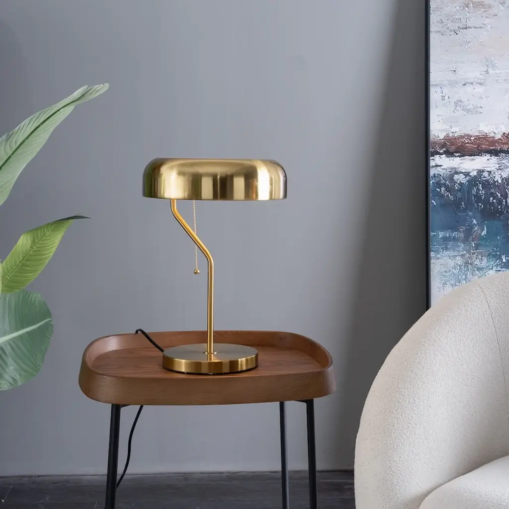 Elevate your living space with this stunning gold and white modern table lamp. The luxurious gold outer shade combined with a clean white inner lining exudes sophistication, while the sturdy metal base ensures durability. Featuring a convenient pull chain switch, this lamp is both functional and stylish, making it perfect for bedrooms, living rooms, or offices. Add a contemporary touch to your home decor with this eye-catching lighting solution. Gold outer shade with a sleek white inner lining for a luxurious finish. Durable metal base provides stability and a modern look. Drum-shaped shade enhances the lamp's contemporary design. Pull chain switch for easy and convenient operation. Compact and versatile design suitable for various spaces. Black power cord for a clean and cohesive aesthetic. Ideal for ambient and functional lighting in any room.