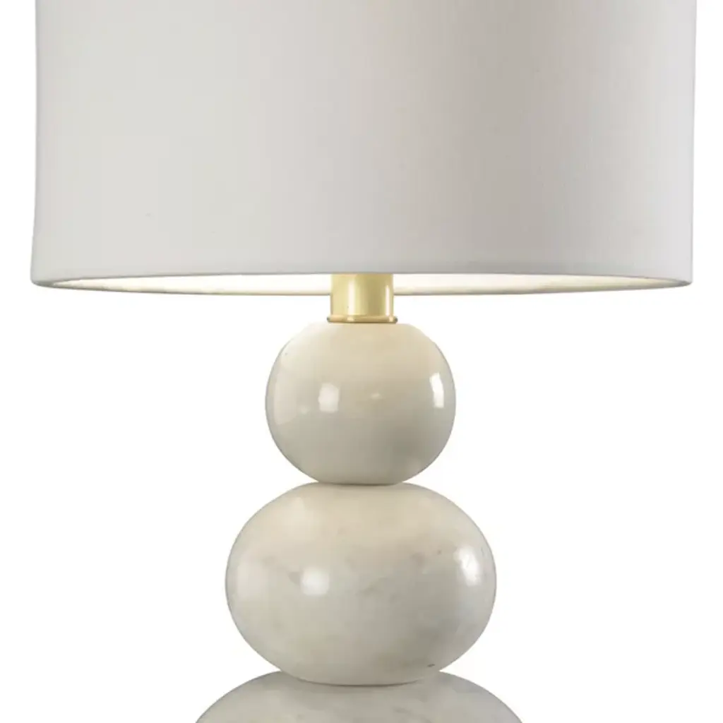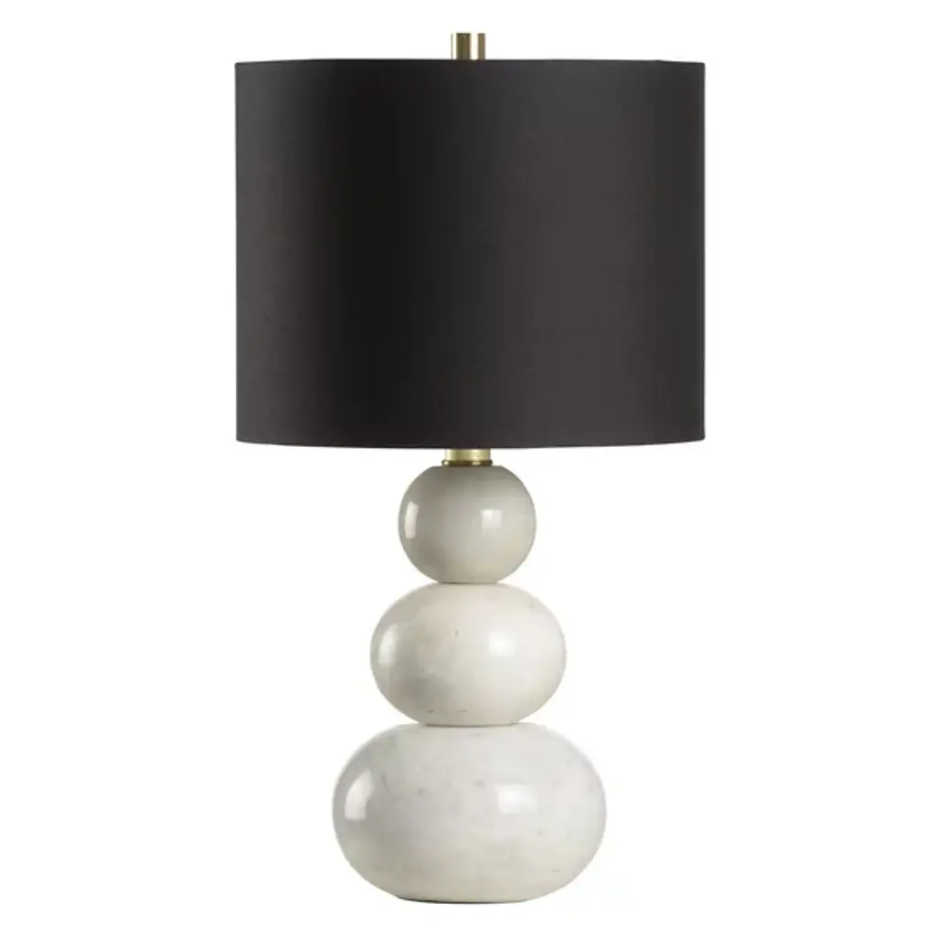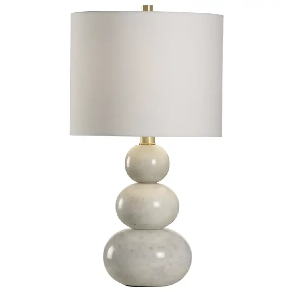 The Bianca Table Lamp from Chelsea House stacks three precisely balanced marble spheres in decreasing sizes to create a gravity-defying impression. The graduated orbs rest perfectly atop one another, challenging perceptions of weight and stability. Natural marble provides an organic counterpoint to the lamp's structured geometry, with each sphere containing unique mineral formations. Light reflects differently across each curved surface, highlighting the material's natural luster and depth. The stacked configuration draws inspiration from zen stone balancing practices, bringing a meditative quality to the piece. A fabric drum shade tops the sculptural base, softening the overall effect of the stone elements below.