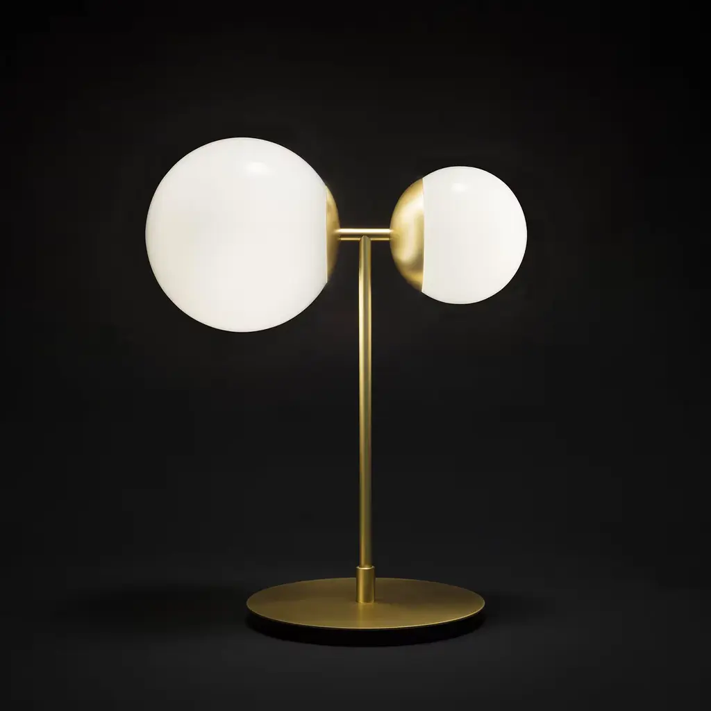 This elegant piece, part of the Biba collection designed by Lorenza Bozzoli, is sophisticated and modern and will be an exquisite addition to any surface in a contemporary home, also combined with the ceiling lamp or floor lamp of the same series. The brass structure boasts a satin finish and is a refined contrasts with the glossy white glass of the two shades of two different sizes.