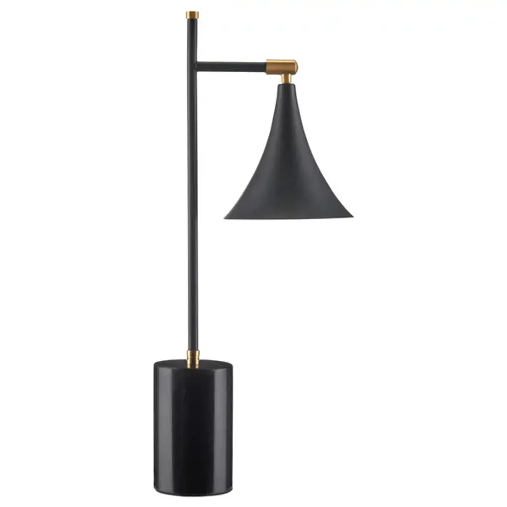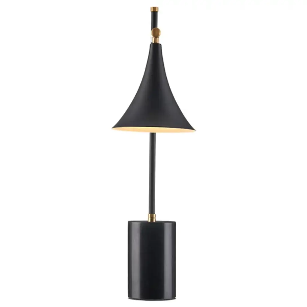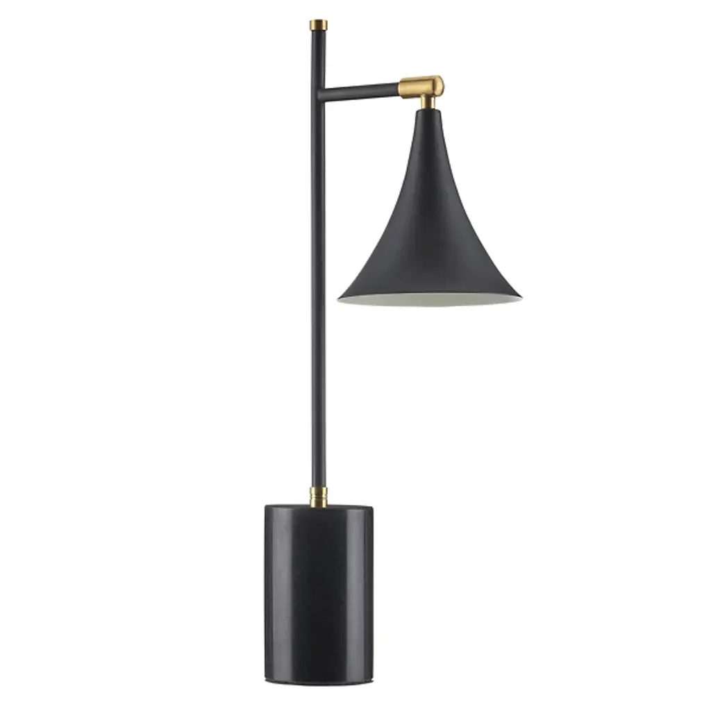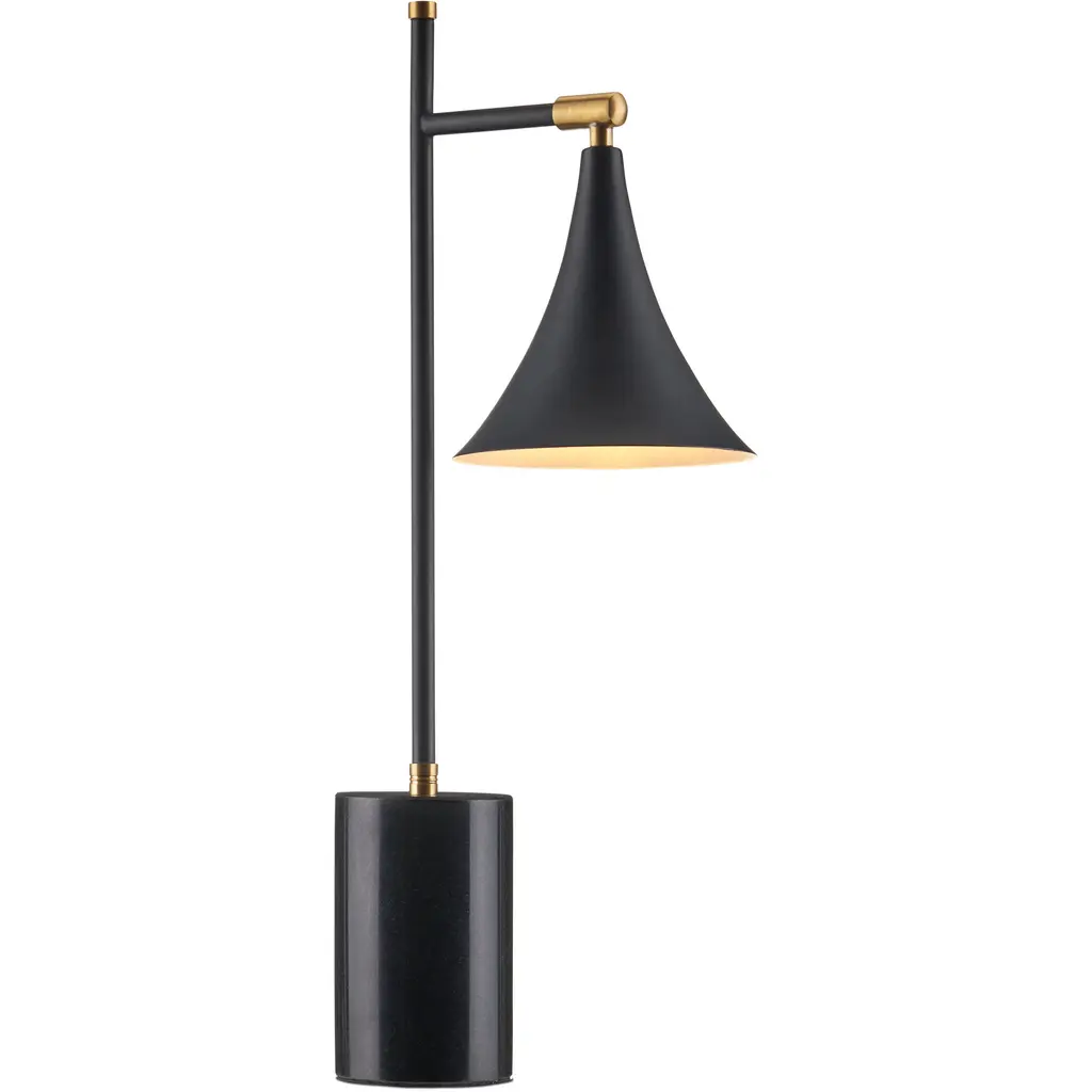 The Bibliophile Table Lamp from Currey & Company directs focused illumination through its fluted shade design. A cylindrical marble base anchors the lamp while adding natural texture to its composition. The thin stem rises gracefully to meet the shade, creating a sensible proportion throughout the piece. Brass accents punctuate the design, offering subtle contrast against the darker elements. The Bibliophile Table Lamp serves as an ideal companion for reading or desk work, combining purpose with urbane aesthetics.