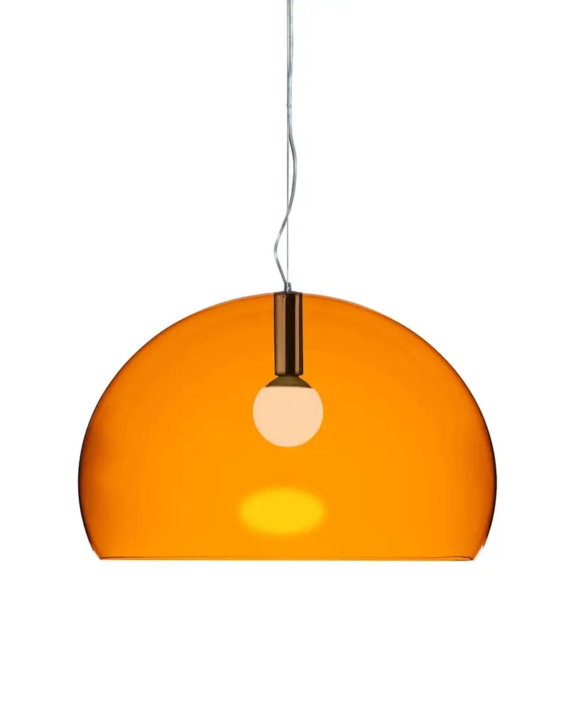 FL/Y is an essentially-styled suspension lamp. The particular transparency of the material and the sheen of the colours recreate the idea of a soap bubble, shimmering iridiscently in the light. The shade is not perfectly hemispherical, with the cut-off falling just below the level of the diameter, offering greater concentration of the light. The lamp is available in three different sizes: Fl/Y (diameter 52cm, shade depth 33cm), Small Fl/Y (diameter 38cm, shade depth 28cm) and Big Fl/Y (diameter 83cm, shade depth 55cm).