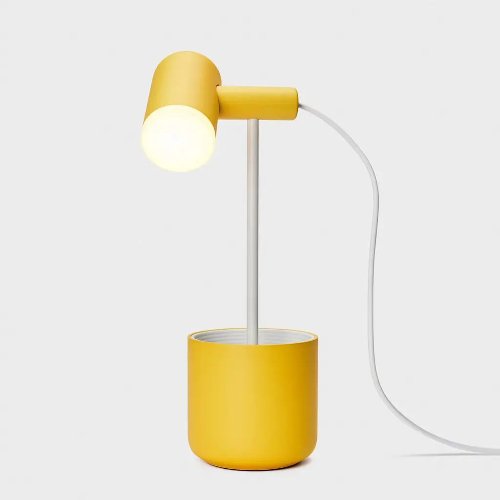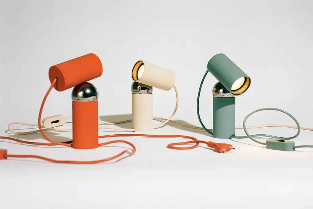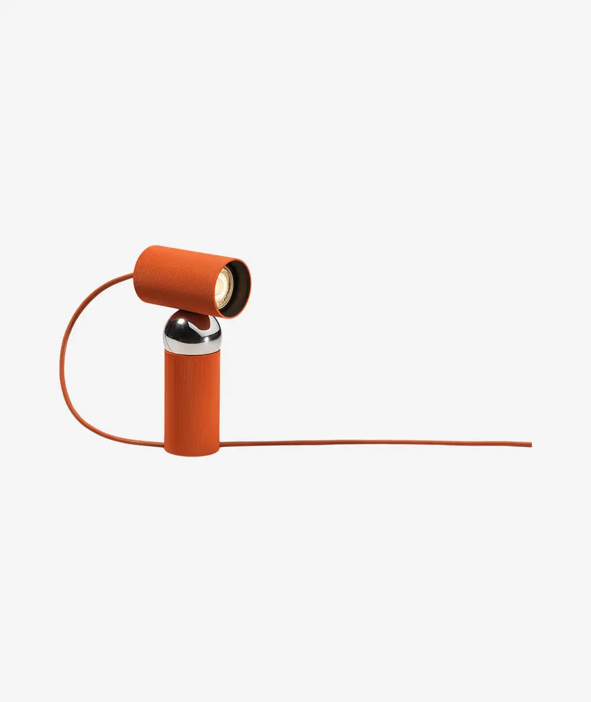 LED bulb table lamp with adjustable head integrating bulb and cut-off providing direct lighting. Body made of a special pigmented polycarbonate deriving from a by-product of paper production rather than from petroleum. Adjustability through steel sphere treated with protective layer deposited in PVD. Useful length of the cable 2 mt. The cable can be adjusted and locked in place through a special slit in the base of the lamp. The product has been designed according to the ISCC standards and it is assembled with total absence of glued components so that it can be completely separated for future recyclability.