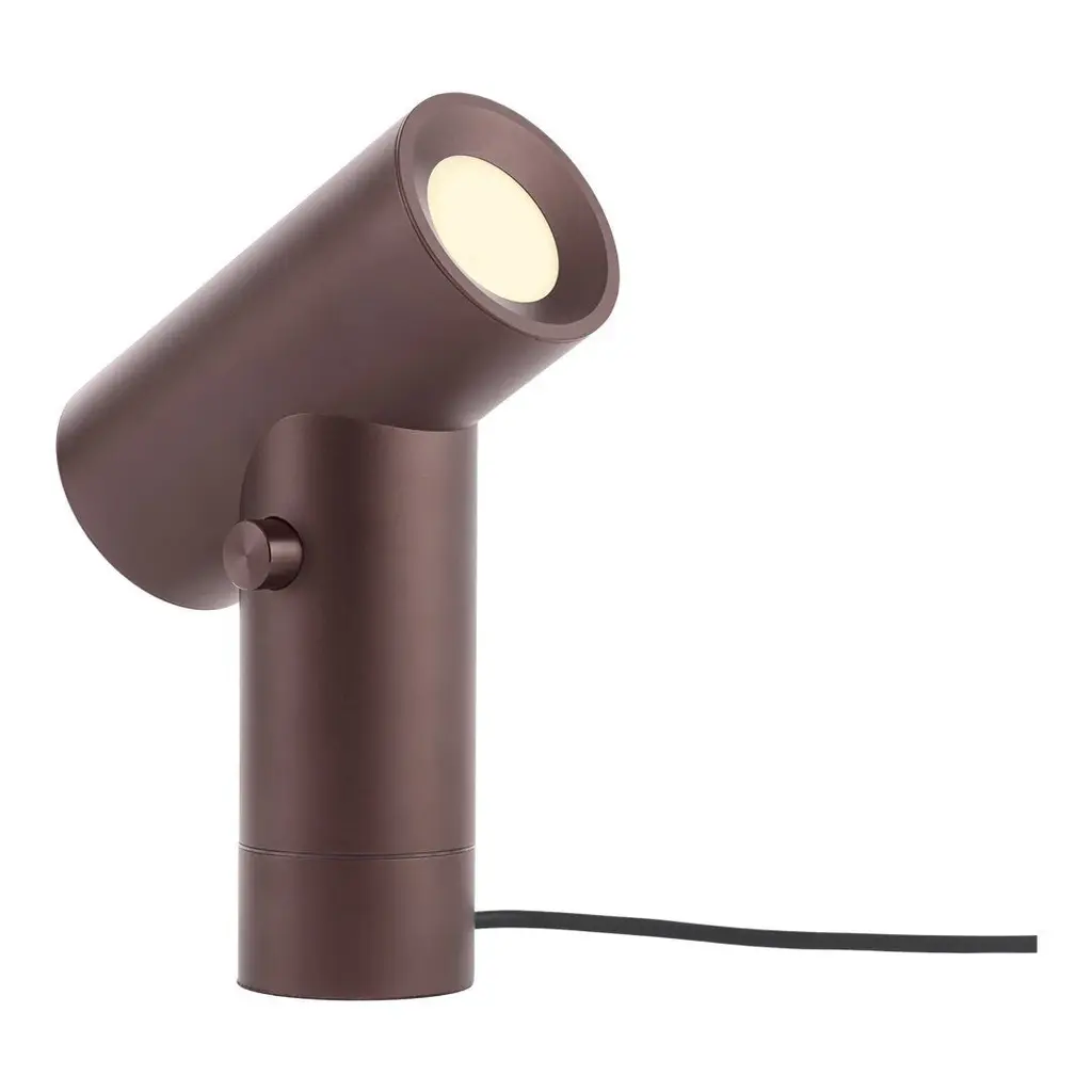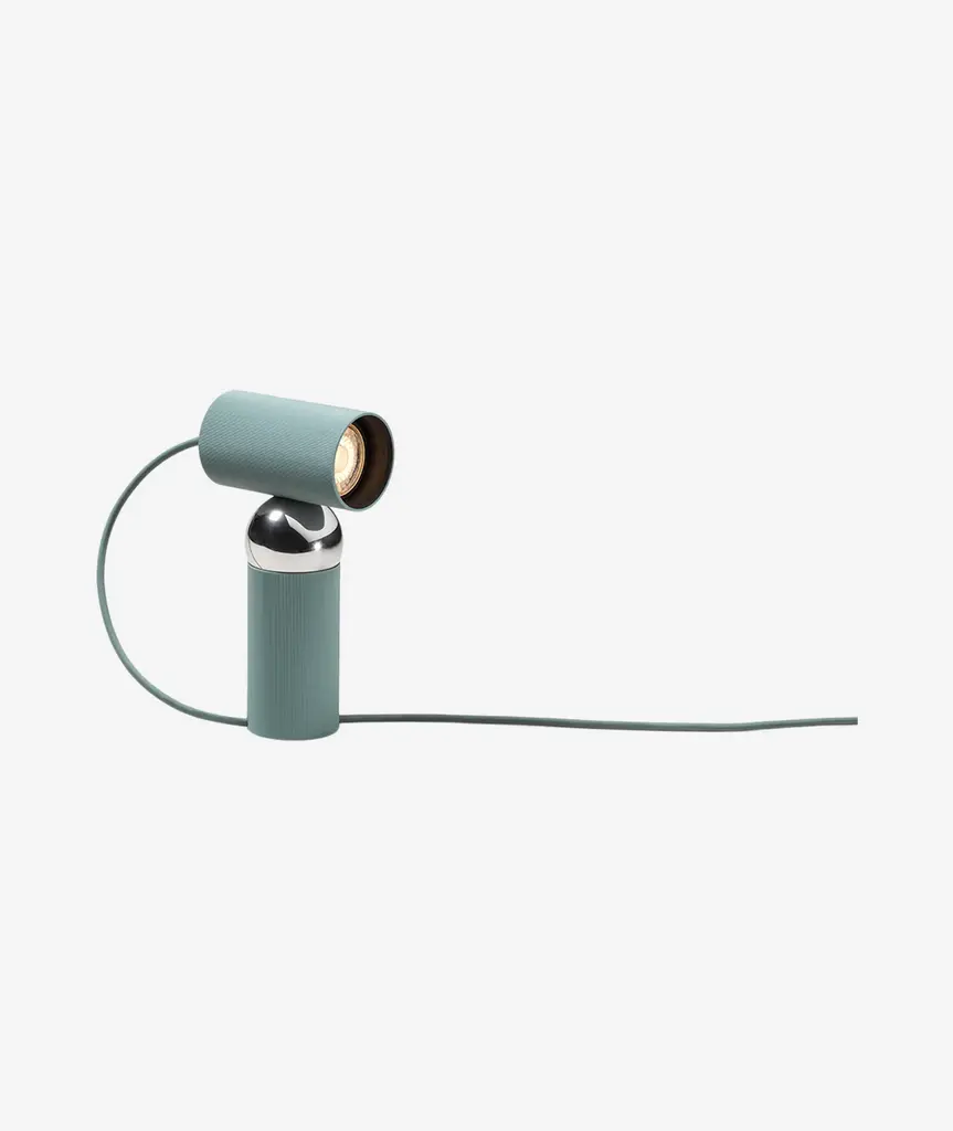 LED bulb table lamp with adjustable head integrating bulb and cut-off providing direct lighting. Body made of a special pigmented polycarbonate deriving from a by-product of paper production rather than from petroleum. Adjustability through steel sphere treated with protective layer deposited in PVD. Useful length of the cable 2 mt. The cable can be adjusted and locked in place through a special slit in the base of the lamp. The product has been designed according to the ISCC standards and it is assembled with total absence of glued components so that it can be completely separated for future recyclability.