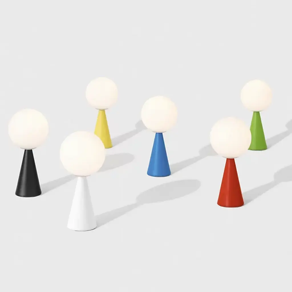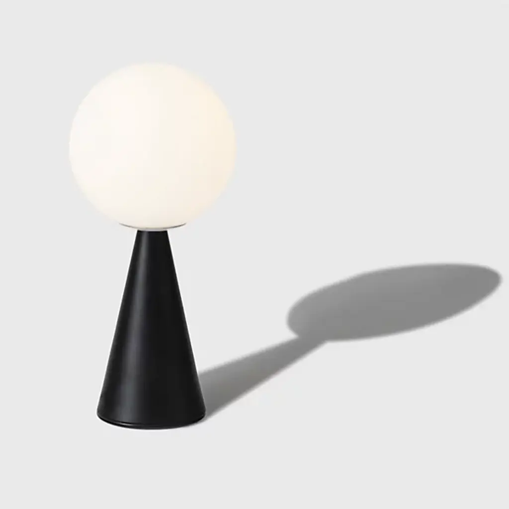 Combining two fundamental shapes, the Bilia Mini Table Lamp by FontanaArte creates a bold and playful display of light in a small package. An iconic design from Gio Ponti, this fixture presents a milky white, orb-shaped shade balancing atop a metal cone base. Its frosted blown glass shade is handcrafted in Italy and designed to elegantly diffuse the light from inside, creating a delicate illumination as it brings life to a tabletop.