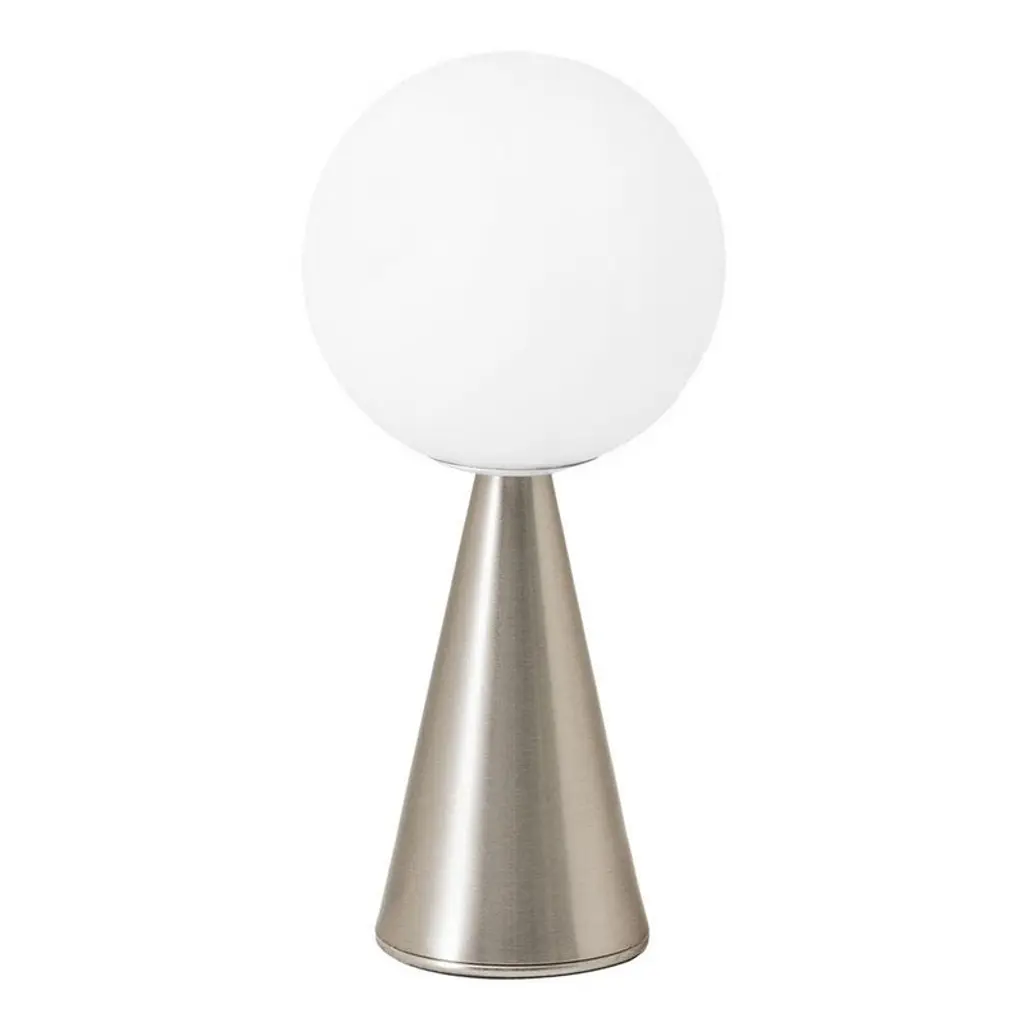 Bilia Mini table lamp, designed by Gio Ponti for FontanaArte, is an Italian design classic from 1932. Bilia Mini combines two essential geometric shapes, a sphere and a cone, in a skilful and balanced manner. The round, frosted glass shade is supported by an upward-tapering metallic base. Bilia Mini range consists of compact yet captivating table lamps in either metallic finishes or coated in colors.