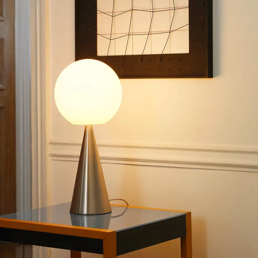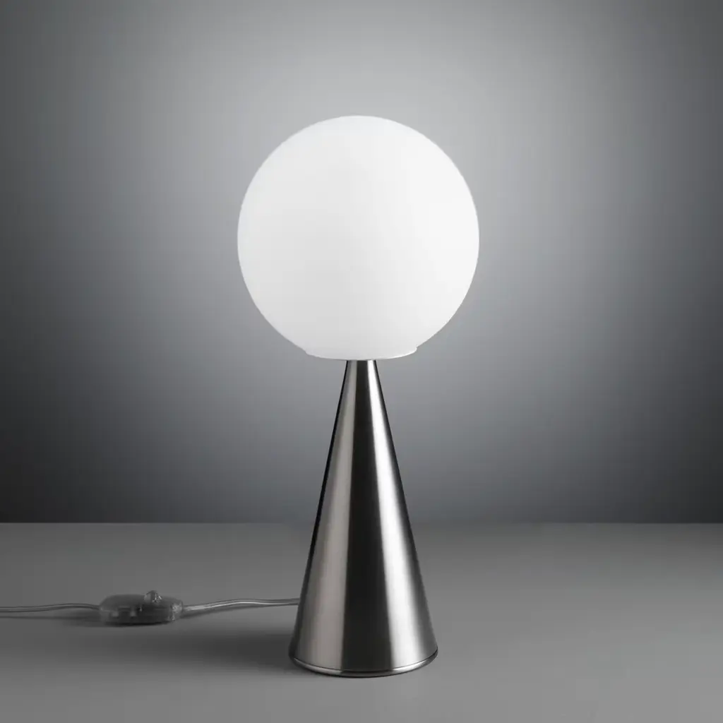 This stunning design by Gio Ponti is a masterpiece of geometric purity and balance. The metal cone with a brushed nickel supports a mouth-blown glass sphere with a satin finish that functions as the diffuser for the dimmable 60 W incandescent E14 bulb (also available with a 42 W halogen E14 bulb). This item is only wired for 220V and it is sold with an adapter.