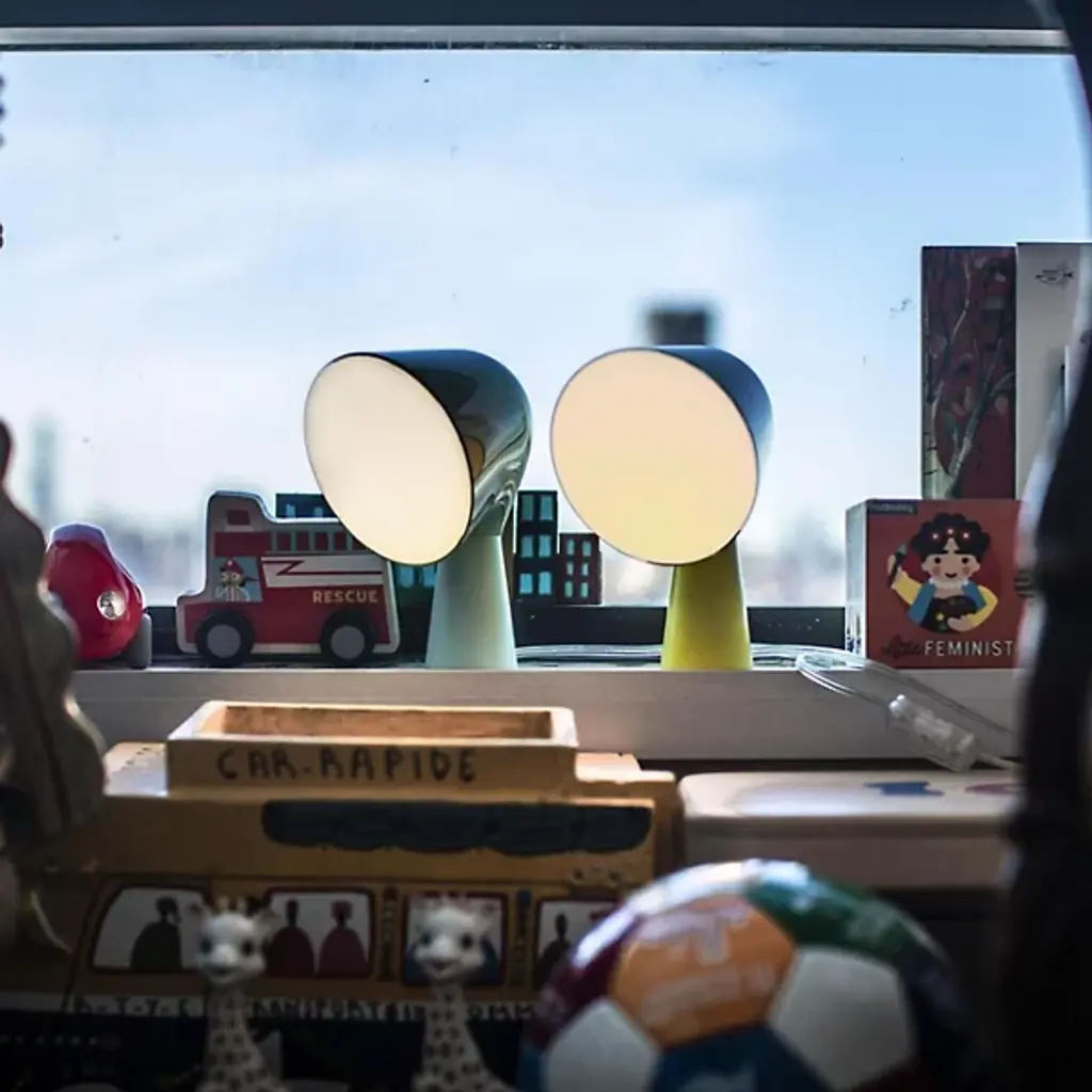 The Foscarini Binic Table Lamp is the cutest little table lamp to grace the modern home. It's made of ABS and features a polycarbonate diffuser that softly spreads fluorescent illumination, its "head" slightly tilted in childlike curiosity. A fun piece of color and light, the Binic makes a great housewarming or graduation gift (if you can bring yourself to give it away).