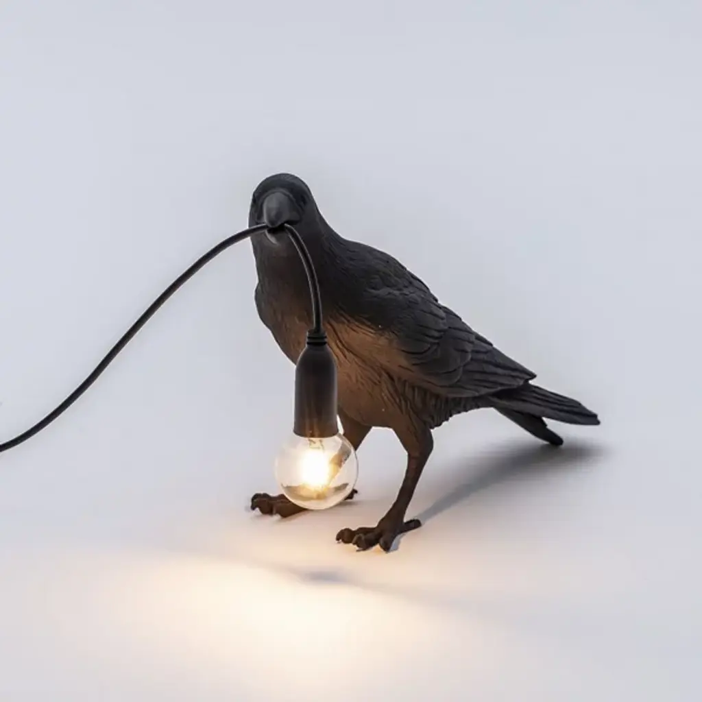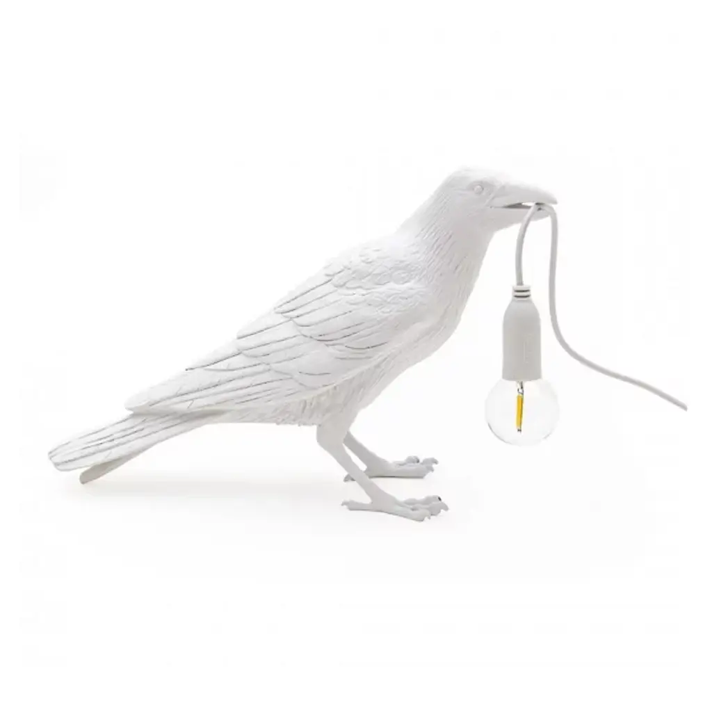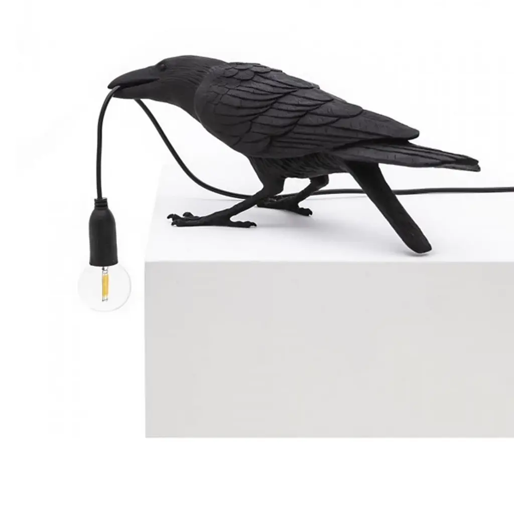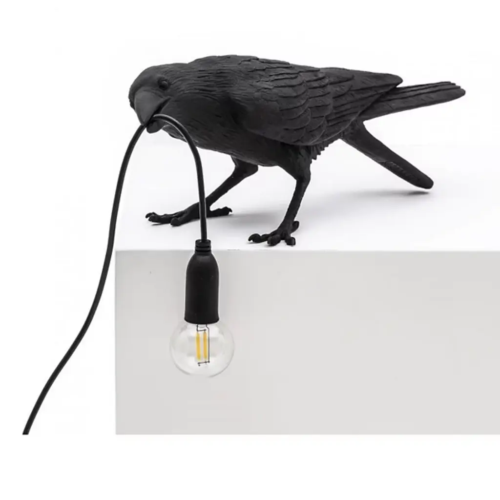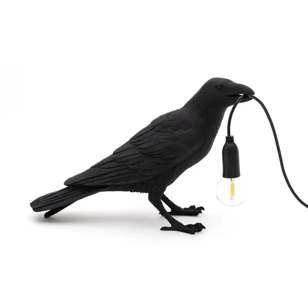 Add a curious and helpful raven to the décor of the outside of your home with the Bird Outdoor Table Lamp from Seletti. Known for their intelligence, this piece features a detailed silhouette of a raven made entirely of resin. Designed by Marcantonio Raimondi Malerba as a look into the relationship between animals and humans, it clutches the cord of the single bulb in its gentle beak, allowing the light to spread in a full and even manner.