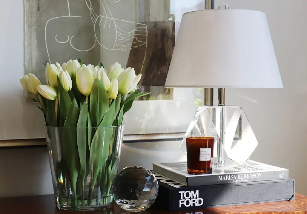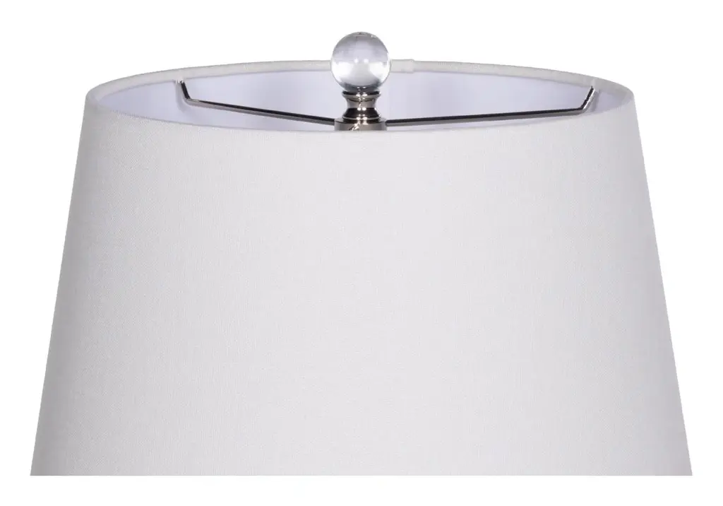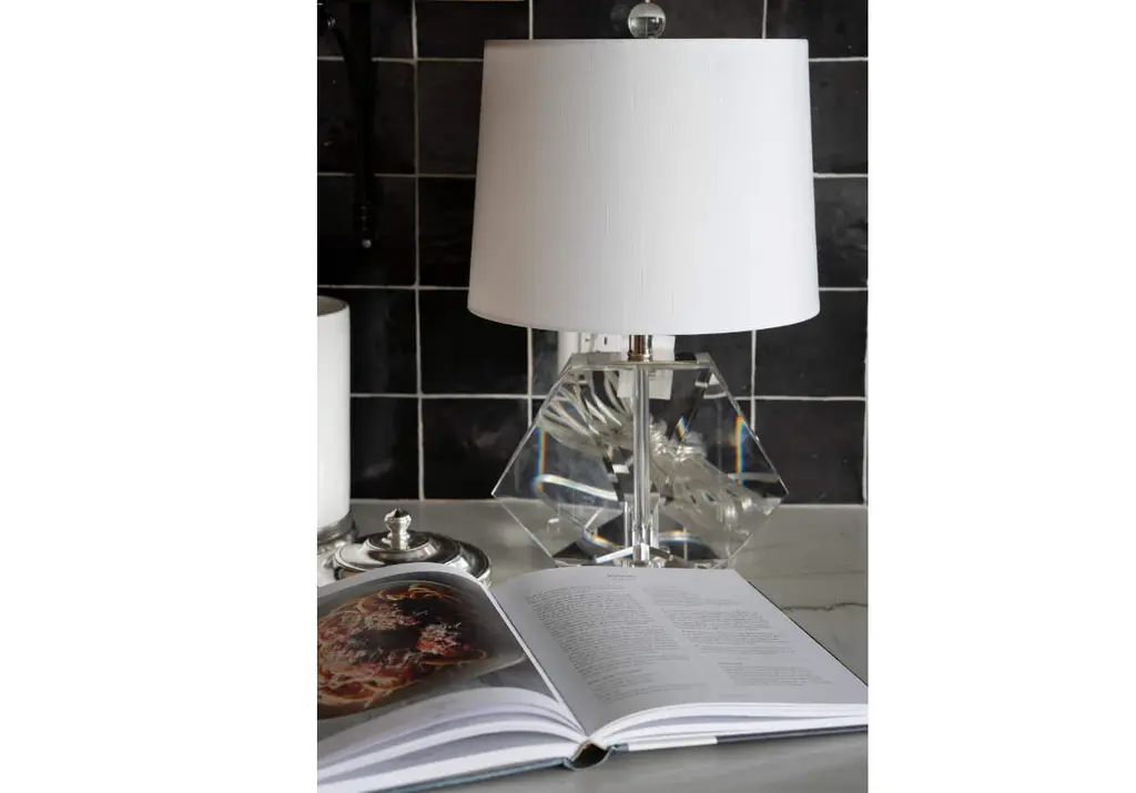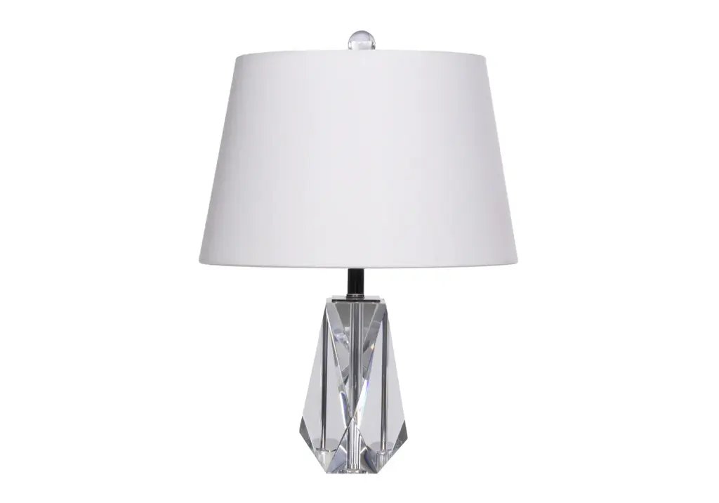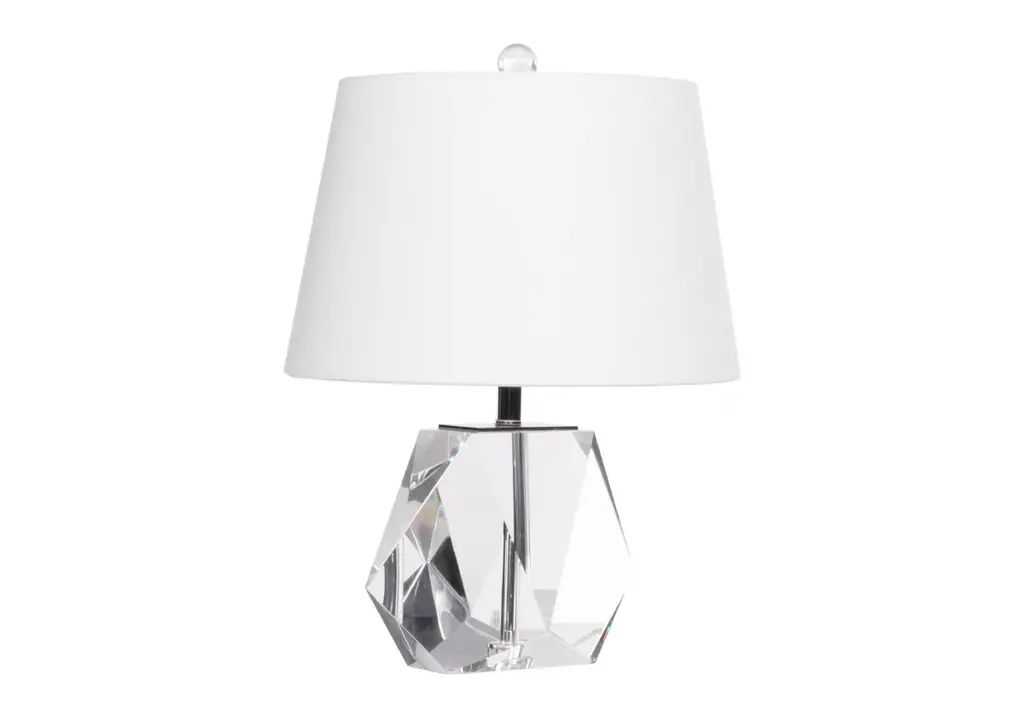 The Birdie lends a glamorous, dimensional style with its geometric solid K1 crystal base, petite size, and round linen shade.