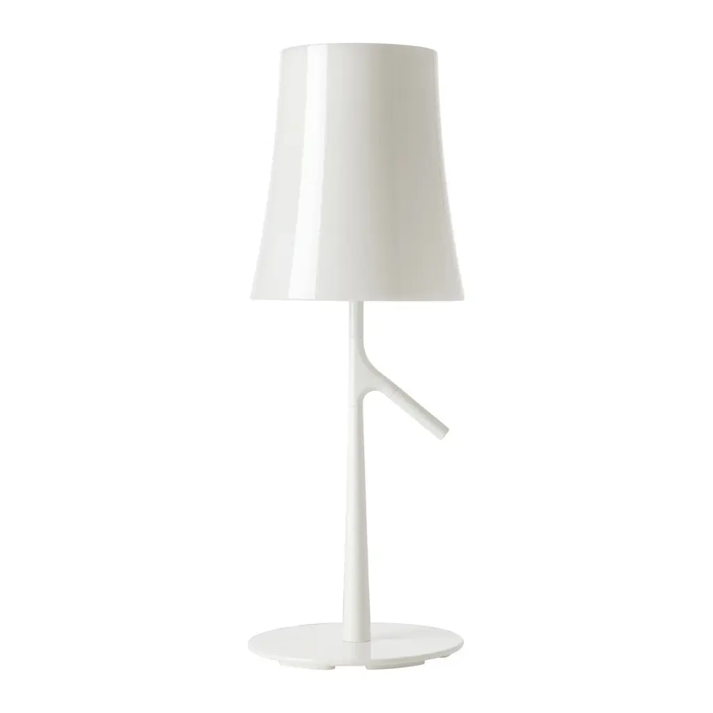 The slim stem recalls the trunk of a tree, its shade is a reinterpretation of the classic reading lamp, while the branch, as if ready for a “birdie” to alight, beckons your touch, turning it on or off. These three elements spontaneously coalesce to give life to a friendly lamp, that combines a smooth and familiar structure with a boldly character. Made with sturdy yet lightweight materials, Birdie has a different personality, depending on the color: in white, it can be discreet and almost invisible, but in grey it becomes more of a prima donna capable playing the starring role of a room. Always monochromatic, from lampshade to the base for a decisive character without compromises. There are two dimensions available for the table lamp, designed to blend in easily with the surroundings. Whether beside an armchair or a sofa in the living room, on the desk in a study, on a bedside table, or in any other room of the house, Birdie fits naturally in and accompanies everyday life with a pleasantly stylish presence. Features