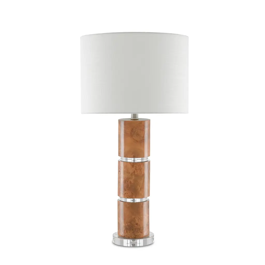 The cylinders on the Birdseye Table Lamp are sheethed in a marbled paper that mimicks the patterns in birdseye maple. Separated by optic crystal discs that match the optic crystal base, these are warm-toned elements on the wood-toned table lamp that are contrasted by the sheen of the crystal and the white shantung shade. In Stock Late January 2026 This image is for illustrative purposes only. The colors shown are accurate within the constraints of lighting, photography, and the color accuracy of your screen.