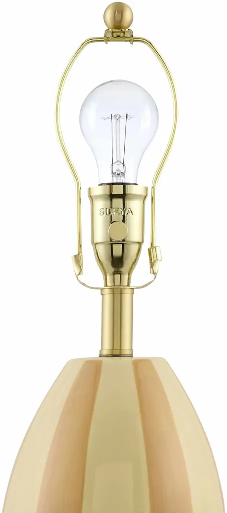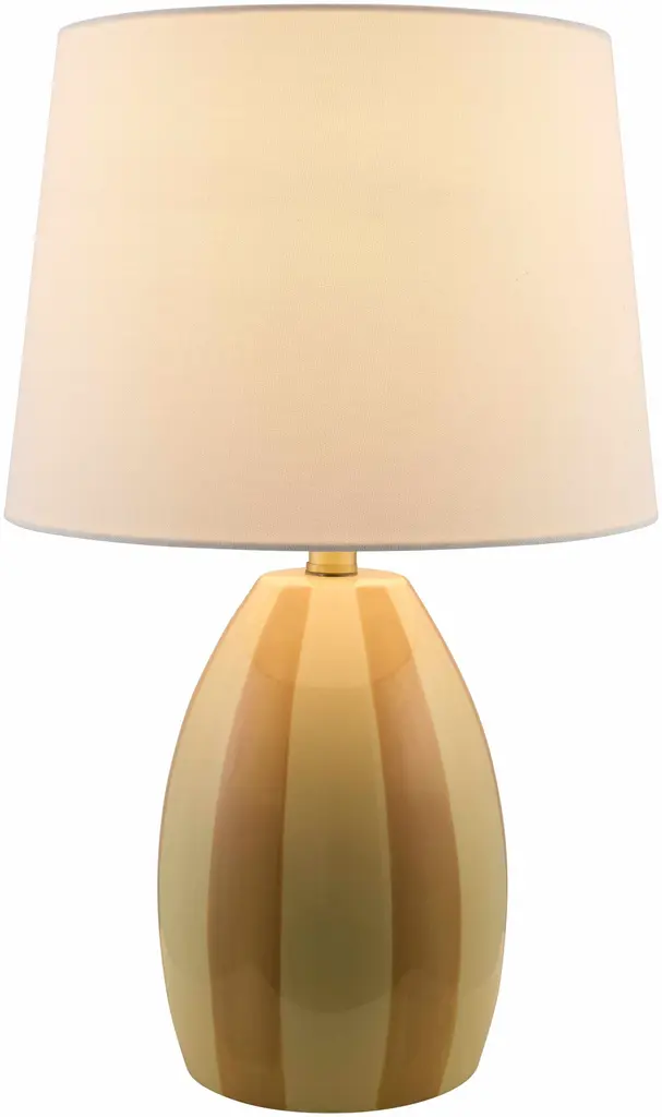 Collection: Biskupiec Colors: Yellow, White, Metallic - Brass, Translucent Material: Body: Ceramic / Shade (Outside): Linen / Shade (Inside): Polyester / Finial: Iron Styles: Contemporary Made In: China Lighting Type: Accent Table Lighting Shade Material: Linen, Polyester Shade Color: White, White Cord Length: 6' Switch Type: On/Off Number of Bulbs: 1 Socket Type: E-26 Bulb Wattage: 100W