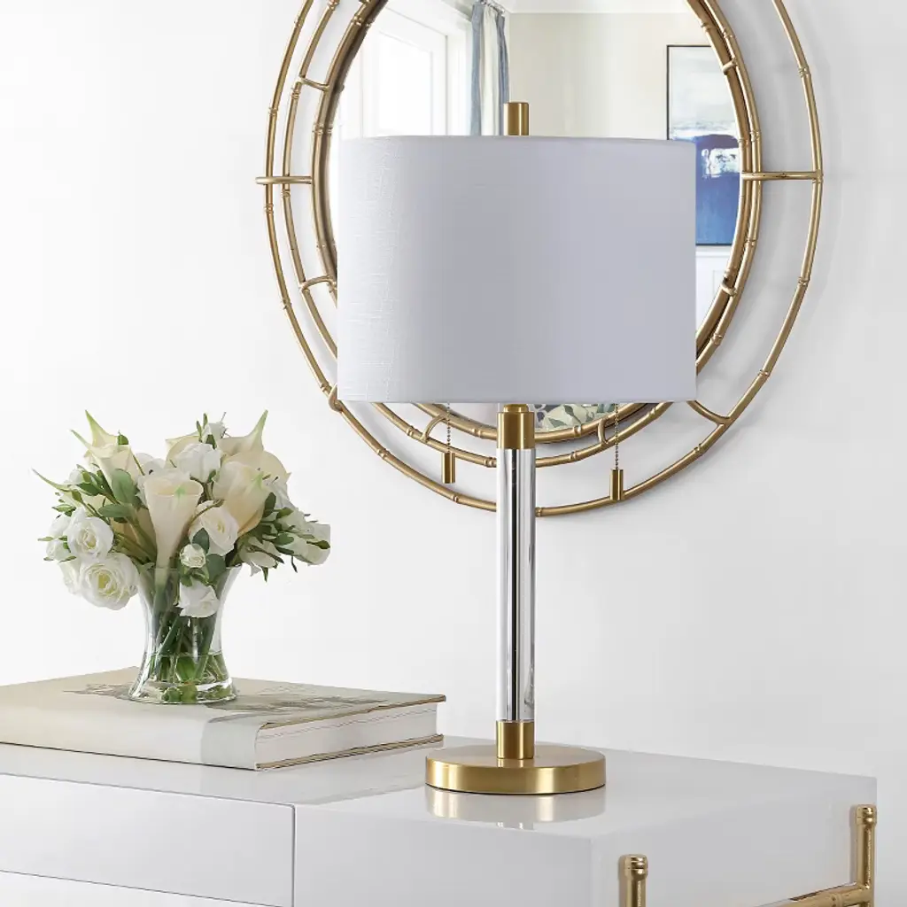 Illuminate your space with the stylish Bixby glass table lamp. Standing at 26.5 inches, this lamp offers a sleek and modern design that seamlessly complements any decor. The white glass body is beautifully contrasted by a brass finish, creating a striking yet elegant look. Made with a composition of 40 percent acrylic for a sleek finish and 60 percent iron for sturdy support, Bixby combines artistry with functional use. Perfect for a living room, bedroom, or office, this lamp not only provides great lighting but also serves as a stunning decorative piece. Its inviting glow and sophisticated presence set the mood for any occasion. Revamp your home ambiance effortlessly with the Bixby table lamp?where style meets function.