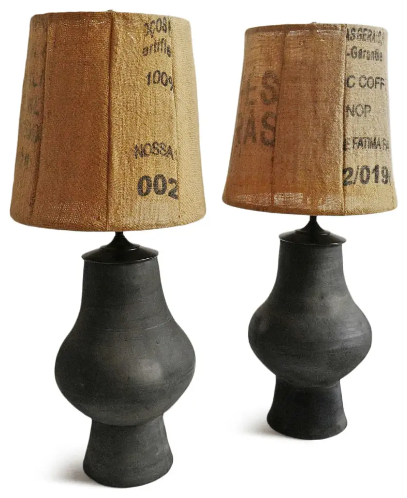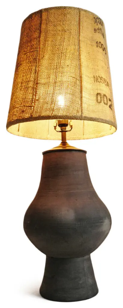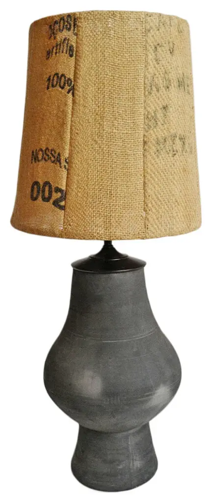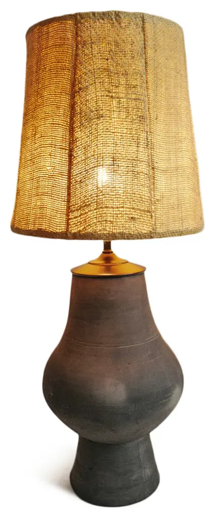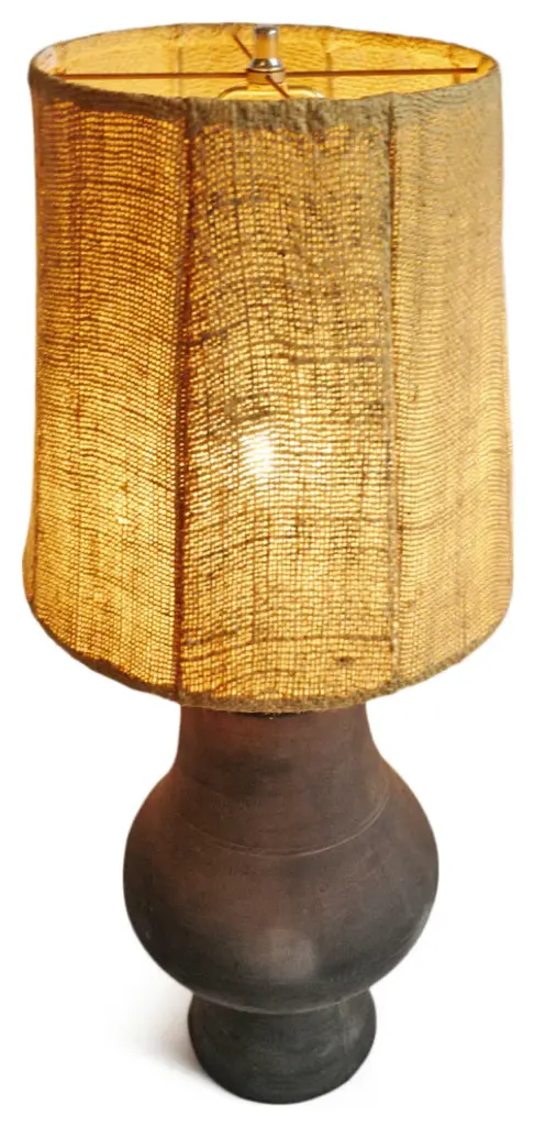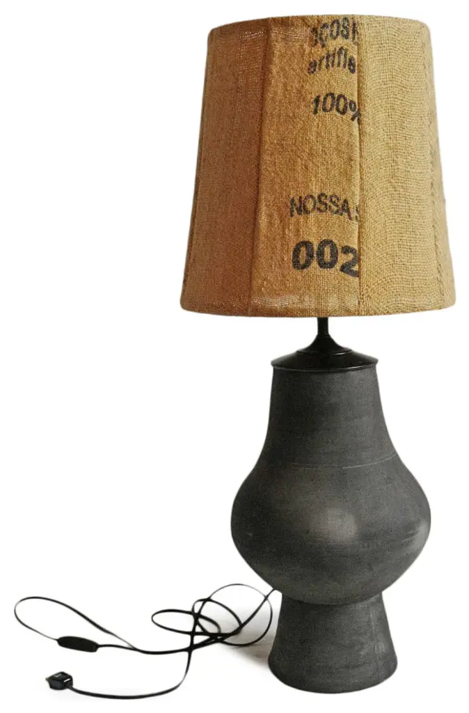 Table lamp with black earth ware base and burlap shade. Each unique and sold individually.Bulb Type: 100 watt maxNumber of Bulbs: 1Bulbs Included: 0UL Certified