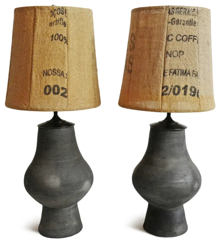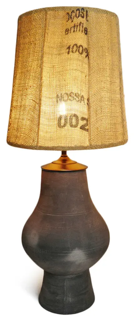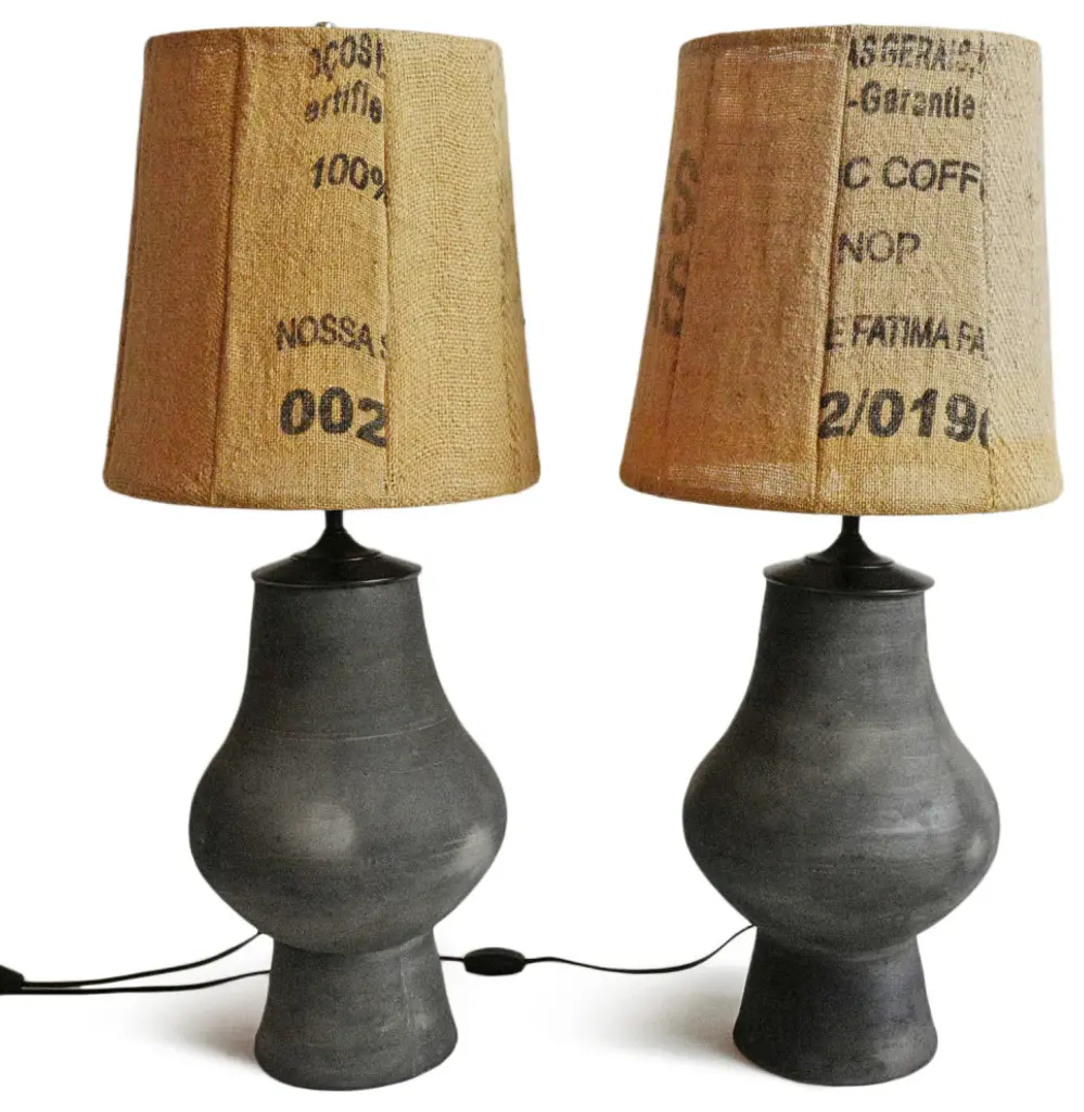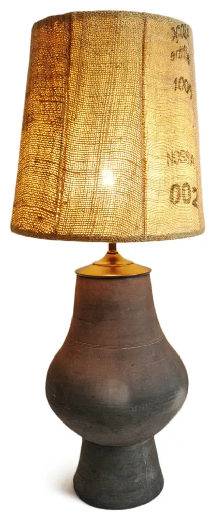 Table lamp with black earth ware base and burlap shade. Each unique and sold individually.Bulb Type: 100 watt maxNumber of Bulbs: 1Bulbs Included: 0UL Certified