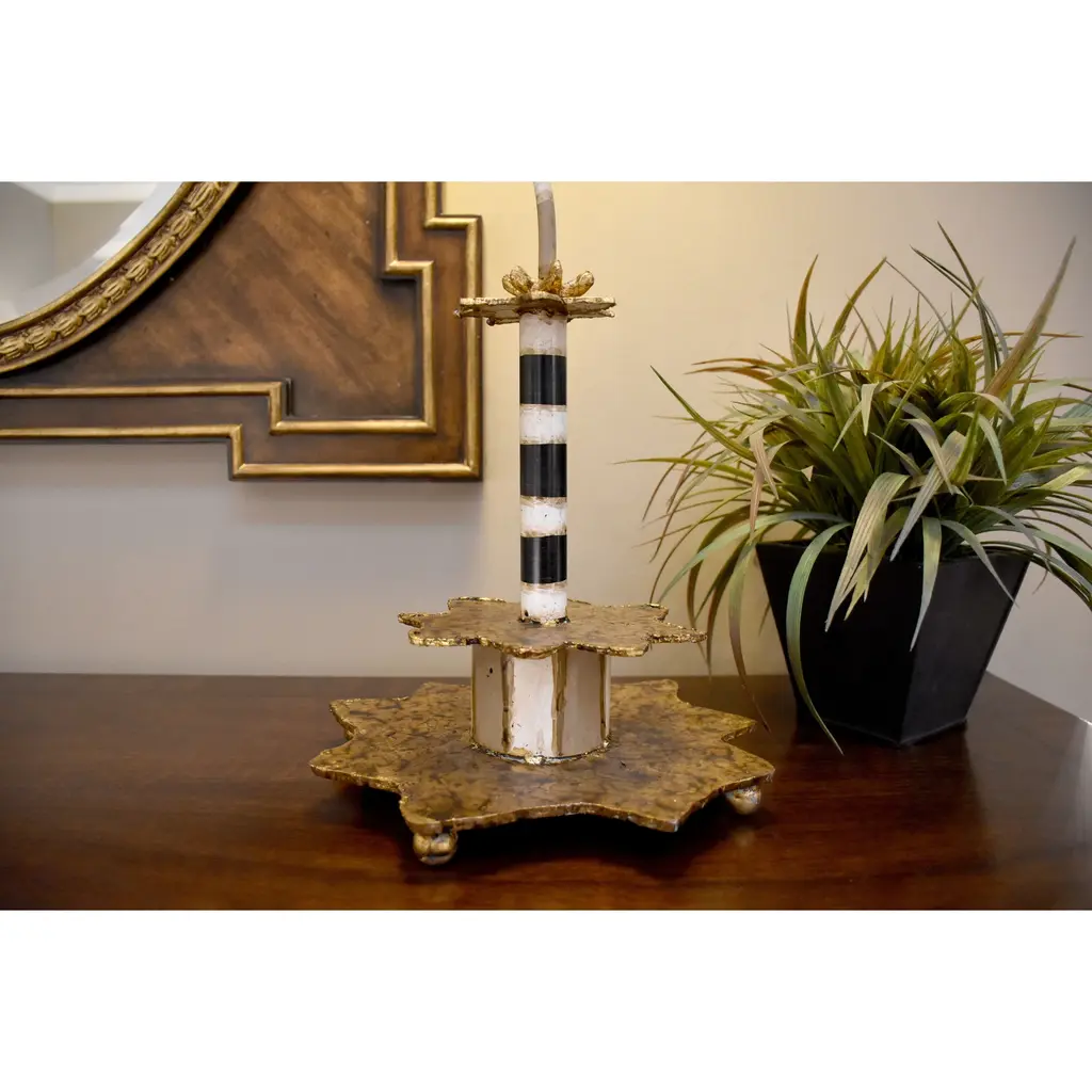 Highlighted by the Classic Charm of using Black and White Stipes and a touch of Antiqued Silver and Gold , this lovely Tall Buffet table lamp adds a Whimsical elegance to your Entryway or study. Complete the vignette by adding a stack of books, frames, and an eye-catching candleholder. Striking a balance between shabby chic and Eclectic, this beauty is a 44 Inch tall table and buffet lamp. Having a unique carved matching finial, and a gold leaf element at the bottom of the lamp brings a sophisticated appeal to this New Orleans Flambeau inspired lamp.