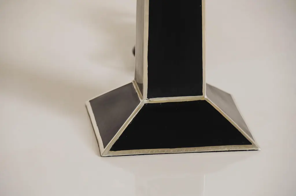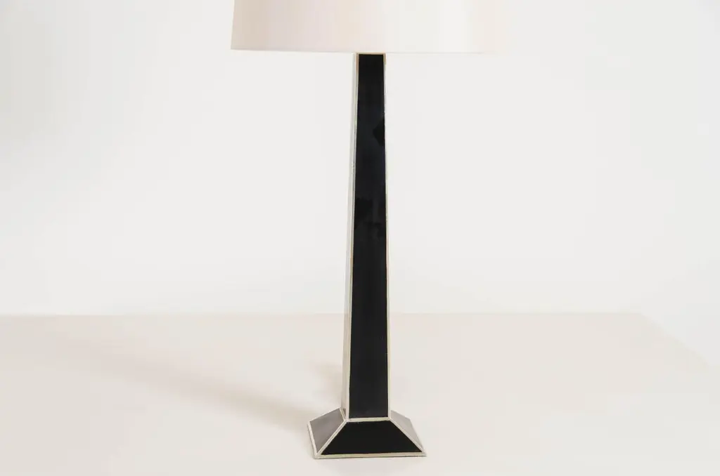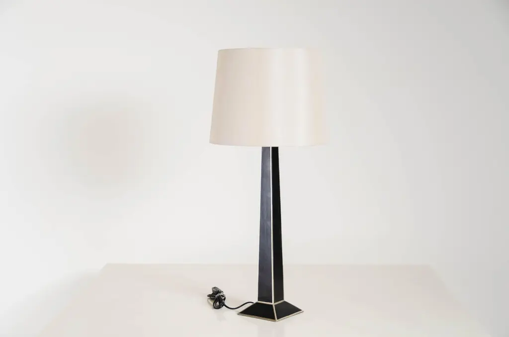 Obelisk table lampBlack lacquer and white bronzeHand repousséNatural silk shadeEach piece is individually crafted and is unique. These pieces are made with at least 60 coats of organic lacquer. Each layer of lacquer is applied with a curing period of 24 hours in between so that it can dry.