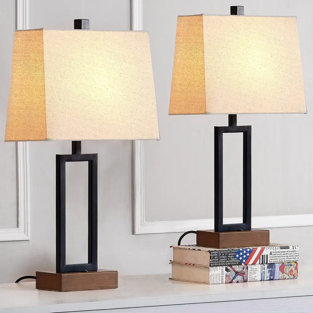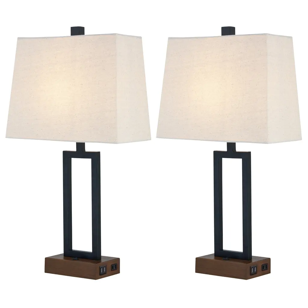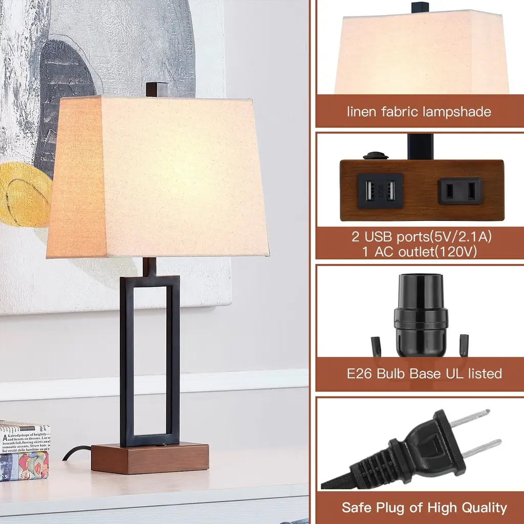 The table lamps boast a modern design that effortlessly complements various interior aesthetics. Crafted with meticulous attention to detail, their metal base provides stability and durability, ensuring these lamps will grace your space for years to come. These lamps are perfectly sized to illuminate your surroundings without overpowering your decor. The balanced proportions make them suitable for bedside tables, desks, or any area where both light and aesthetics matter. Embrace the modern age of convenience with the built-in dual USB charging ports. Charge your devices directly from the lamps, eliminating the need for multiple outlets and freeing up your power sources for other essentials. The table lamps come complete with light bulbs, sparing you the hassle of finding the right fit. Each lamp features an E26 bulb base that accommodates the included bulbs, emitting a warm and inviting glow that enhances the ambiance of your space. With a maximum wattage support of 25 watts and an AC outlet, these lamps offer both a soft, ambient light and efficient energy consumption. Illuminate your room with the perfect level of brightness for relaxation, work, or any activity. Choose the lighting that best suits your needs, whether you prefer warm-toned ambiance or vibrant, focused illumination.Overview of features:
