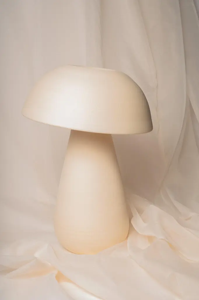 Black Raw Small Mushroom Lamp by Nick PourfardDimensions: Ø 33 x H 38 cm.Materials: ceramic.Different finishes available. Please contact us.All our lamps can be wired according to each country. If sold to the USA it will be wired for the USA for instance.Designed with the intention of creating a light that is multi-directional within its own form and functions without additional hardware.A hand-thrown ceramic lamp that is comprised of two pieces. Using a ball joint design, the upper rests on the base allowing for movement of the light in any direction. This helps the user shift the shade as needed, creating an experience that is both functional and intimate.Like all handmade pieces there is natural variation in the clay, firing, and shape. No two items are exact matches, please consider this when ordering.Nicholas Bijan Pourfard is a furniture and lighting designer based in Southern California. Pourfard is completely self-taught in woodworking and machining, though he double-majored in industrial design and business marketing at San Francisco State University. He’s been building furniture and lighting for himself but only started promoting it this past year. Furniture design has its parameters, of course, but it’s allowed Pourfard to contrast the precision of measurement and the patterns of math with something more loose — organic shapes offset by angularity, like his Bloop lighting, where plump handblown glass blobs glow and rest on a base of geometric steel. There’s something companionable, a kind of friendly quality, to his pieces, whether it’s the warmth of his ceramic Mushroom lamps or his Box chairs, which despite the rigor of their form, still invite you to sit.