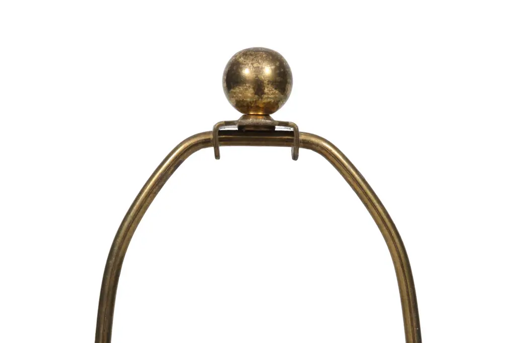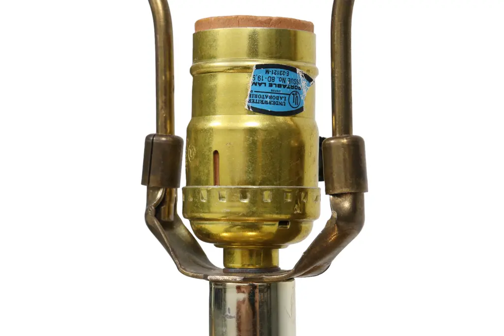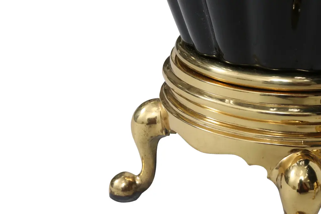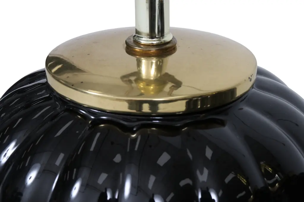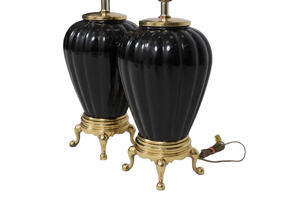 A pair of black ceramic table lamps. Ribbed baluster vases rest on brass bases raised on cabriole legs and finished with pad feet. Wired and working. Each lamp measures 9.5"W x 9.5"D x 21.5"H to top of socket, 32"H to top of finial.