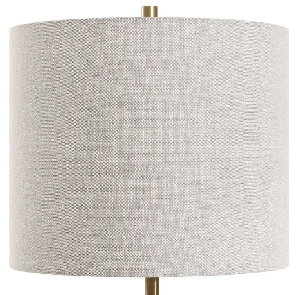 This table lamp has a ceramic base with a textured finish in a warm black tone, highlighted by antique brass plated accents. It is finished with a light gray linen hardback drum shade that enhances its contemporary look.
