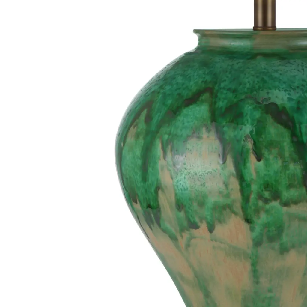 The table lamp is crafted from hand-thrown porcelain that has a painterly glaze applied to its surface before firing to create an organic, free-flowing pattern. The glaze forms natural drips and gradients as it moves across the lamp, resulting in subtle variations in color saturation and patterning so no two pieces are exactly alike. This individuality is part of the lamp’s charm, reflecting the artisanal process behind its creation.