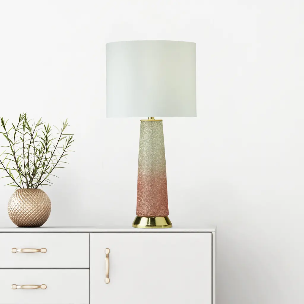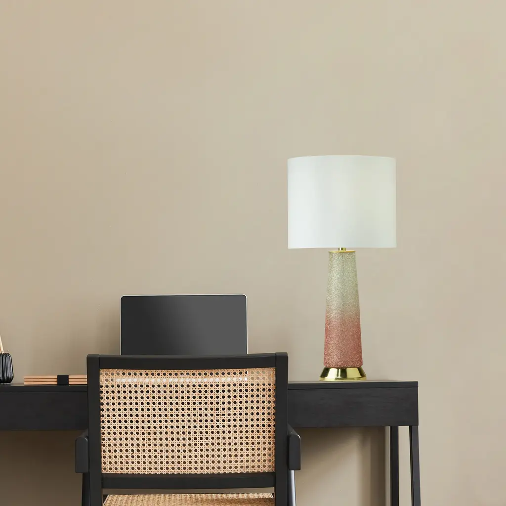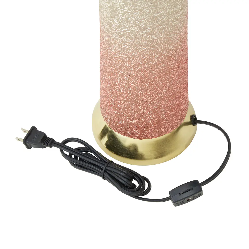 Give the lighting in your living room, bedroom or foyer a stylish update with this mixed-material table lamp. A perfect addition to glam or modern decor, this lamp showcases a cylinder base made from pink/silver ombre beaded glass with a gold-tone metal piece in the center supporting the eggshell white fabric drum shade. This lamp lights up with one 60-watt Type A bulb (not included) and thanks to the 65-inch power cord with an in-line switch, it can easily be placed on any side, console or bedside table.